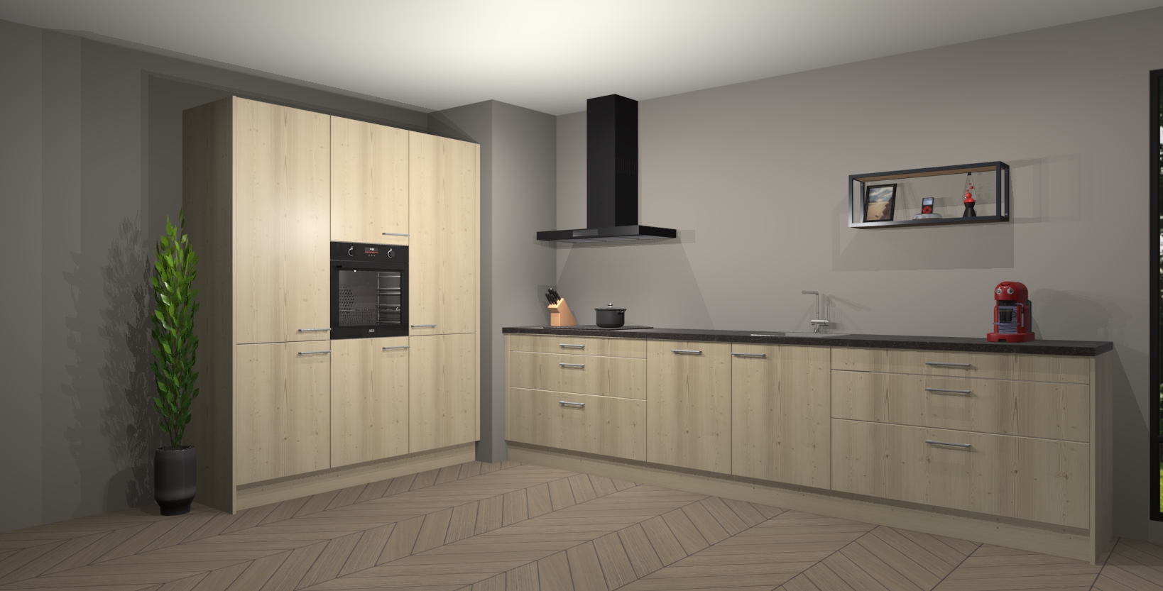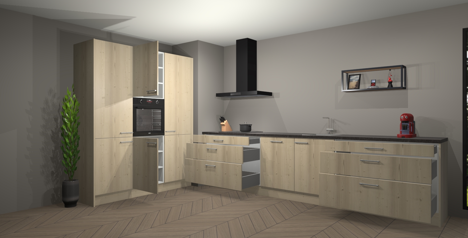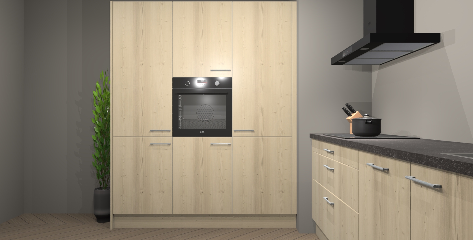 De softclose deuren openen en sluiten is ook heel eenvoudig - geniet van een moeiteloze keukenervaring, zelfs als er kinderen rondlopen. Voor extra gemak bij het plaatsen van uw bestelling bieden we ook een upgrade naar een kookplaat met geïntegreerde afzuiging.