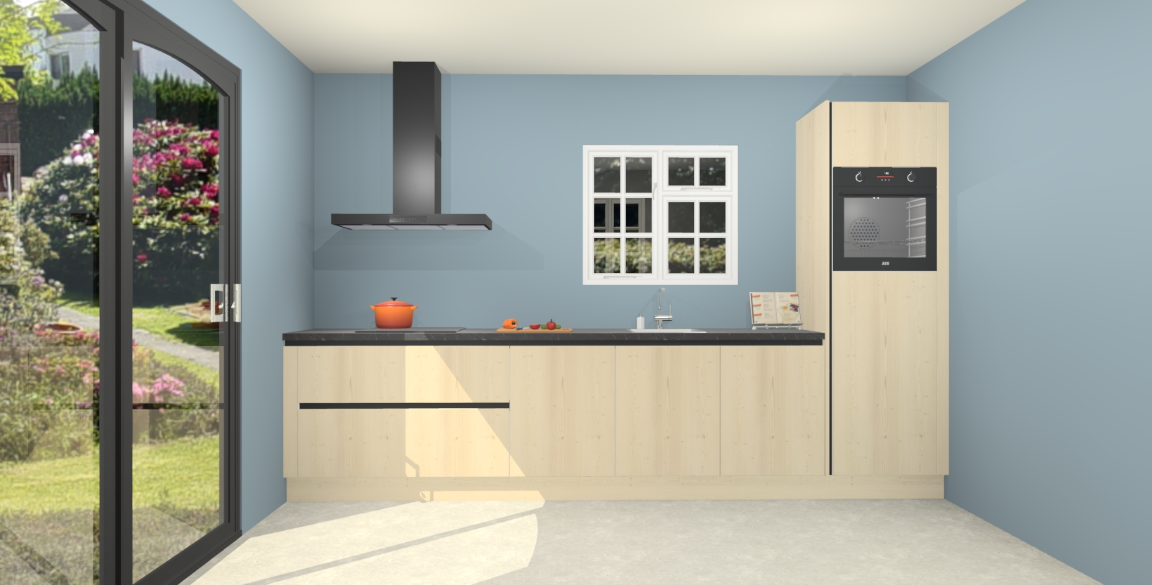 Maak kennis met de olm keuken Sofia: de perfecte mix van stijl en gemak. De keuken heeft vijf inbouw apparaten, plus een werkblad in houtlook dat meteen warmte en verfijning toevoegt.