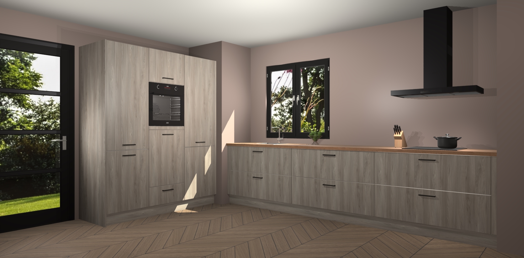 De softclose deuren openen en sluiten is ook heel eenvoudig - geniet van een moeiteloze keukenervaring, zelfs als er kinderen rondlopen. Voor extra gemak bij het plaatsen van uw bestelling bieden we ook een upgrade naar een kookplaat met geïntegreerde afzuiging.