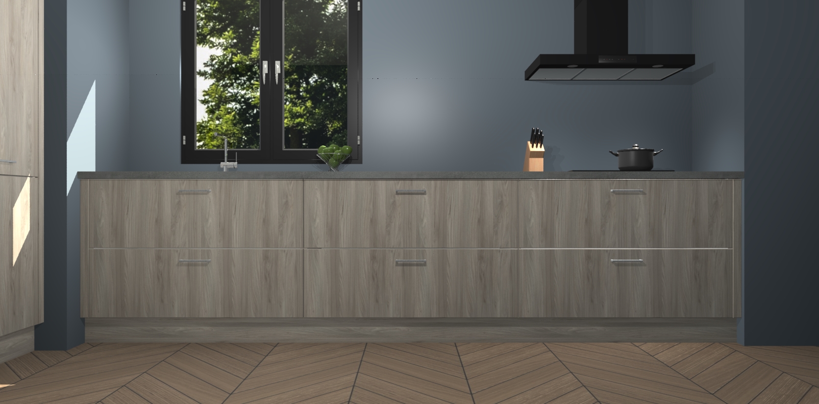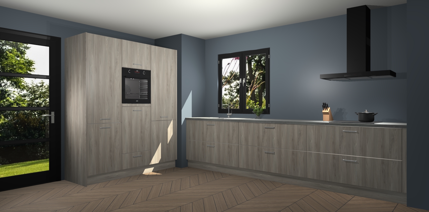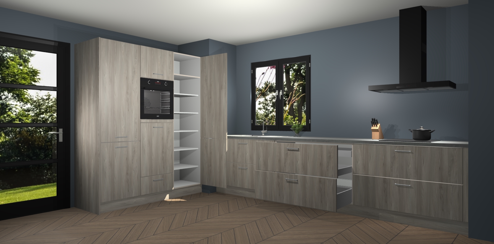 De softclose deuren openen en sluiten is ook heel eenvoudig - geniet van een moeiteloze keukenervaring, zelfs als er kinderen rondlopen. Voor extra gemak bij het plaatsen van uw bestelling bieden we ook een upgrade naar een kookplaat met geïntegreerde afzuiging.