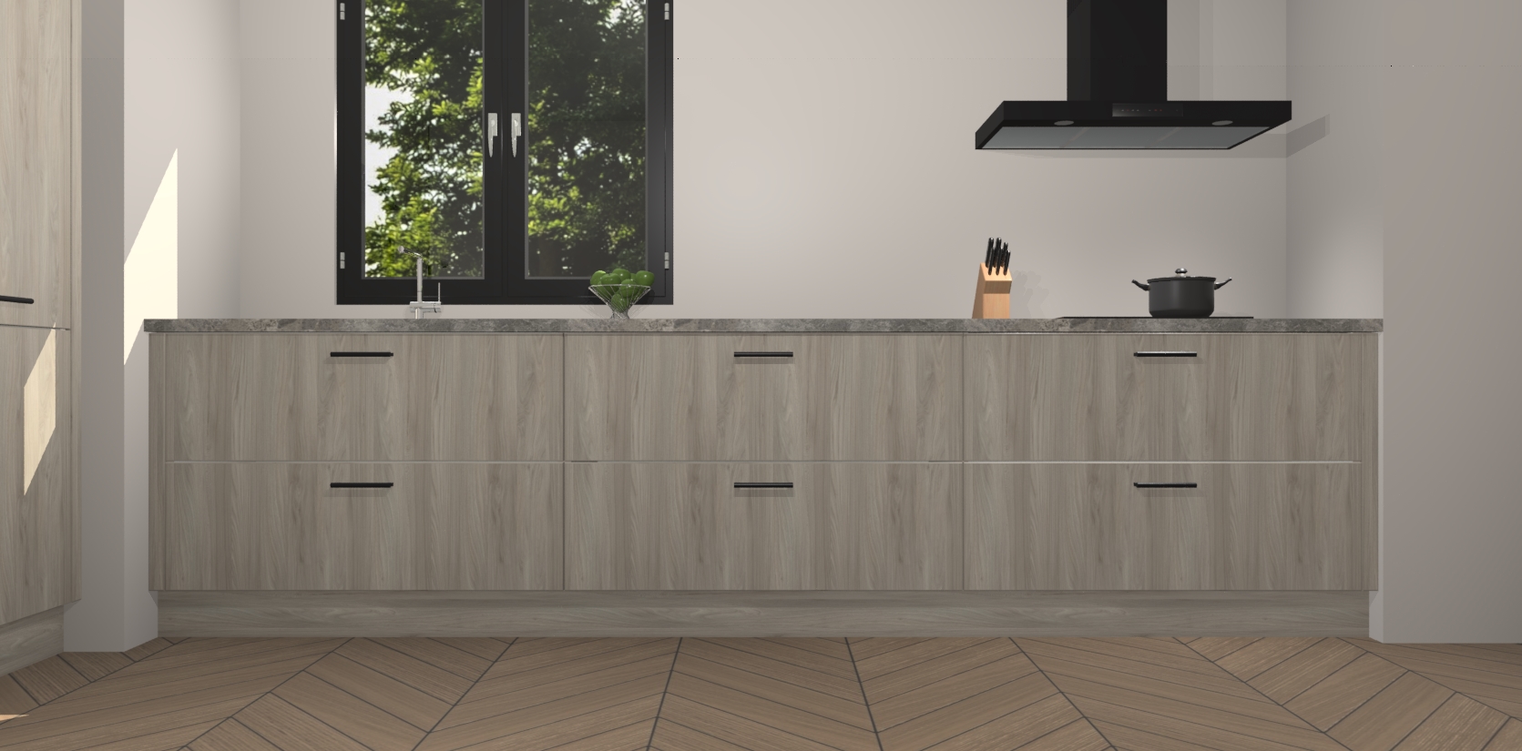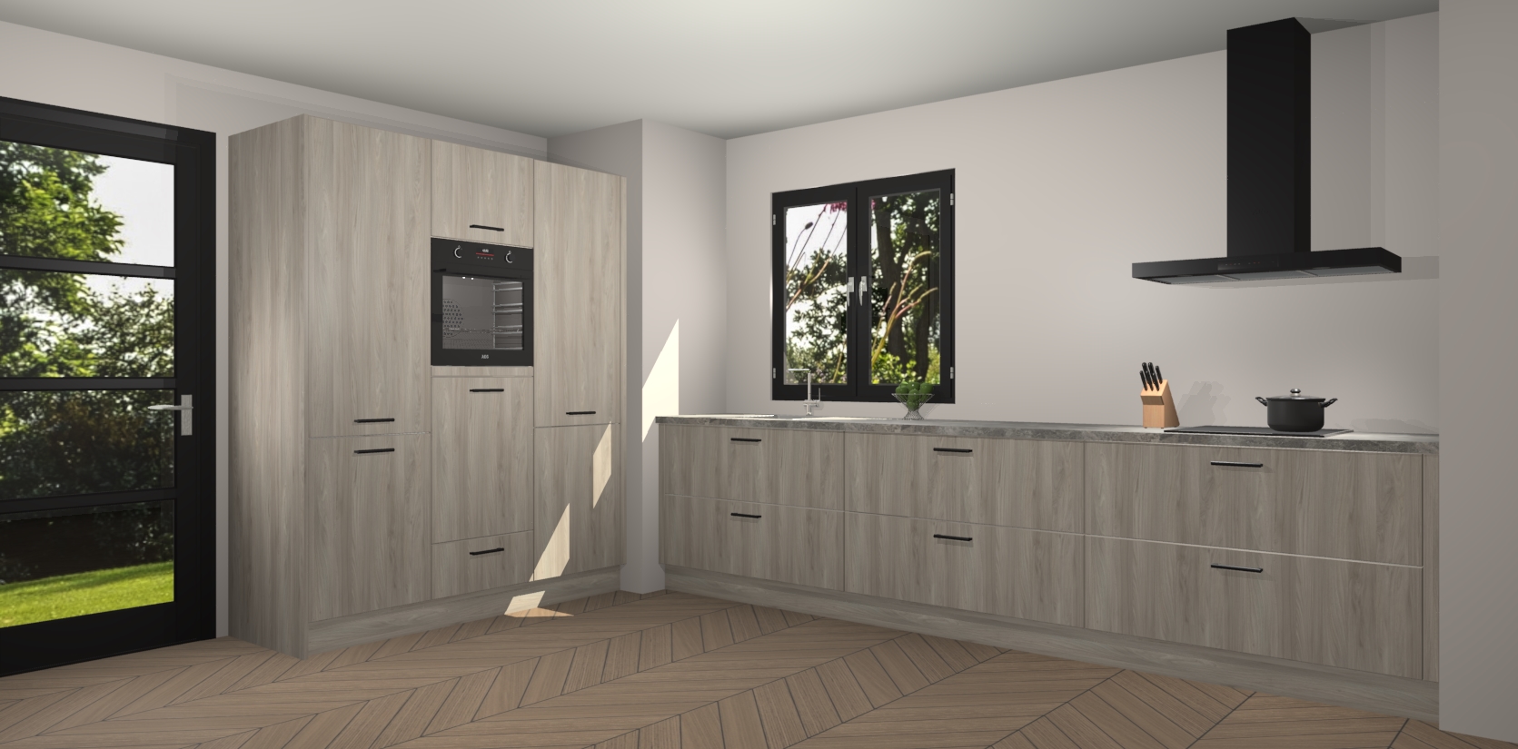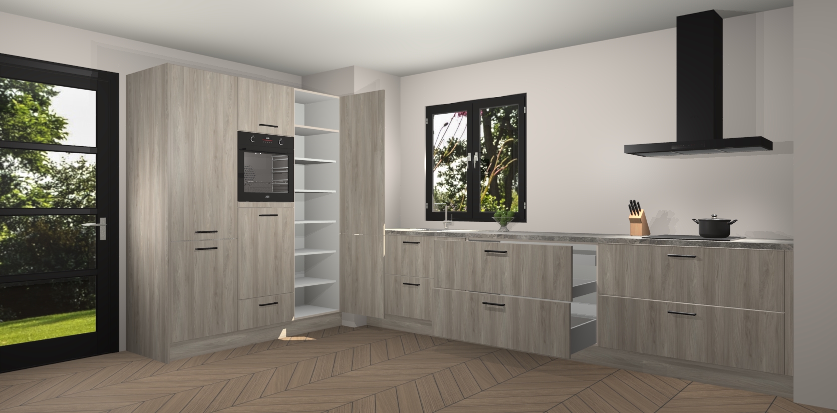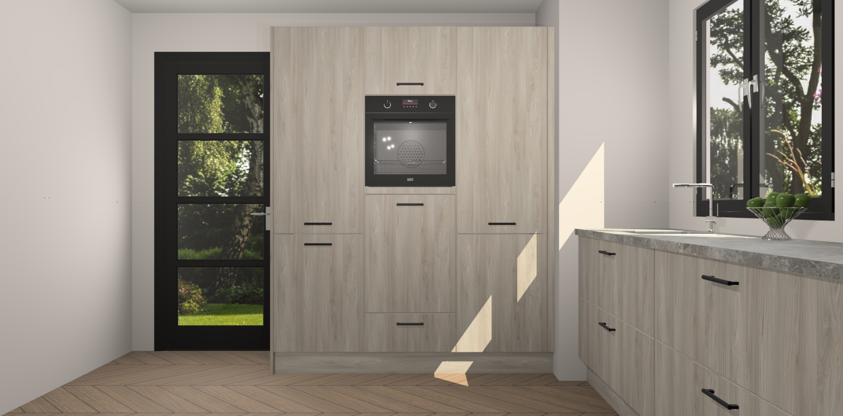 De softclose deuren openen en sluiten is ook heel eenvoudig - geniet van een moeiteloze keukenervaring, zelfs als er kinderen rondlopen. Voor extra gemak bij het plaatsen van uw bestelling bieden we ook een upgrade naar een kookplaat met geïntegreerde afzuiging.