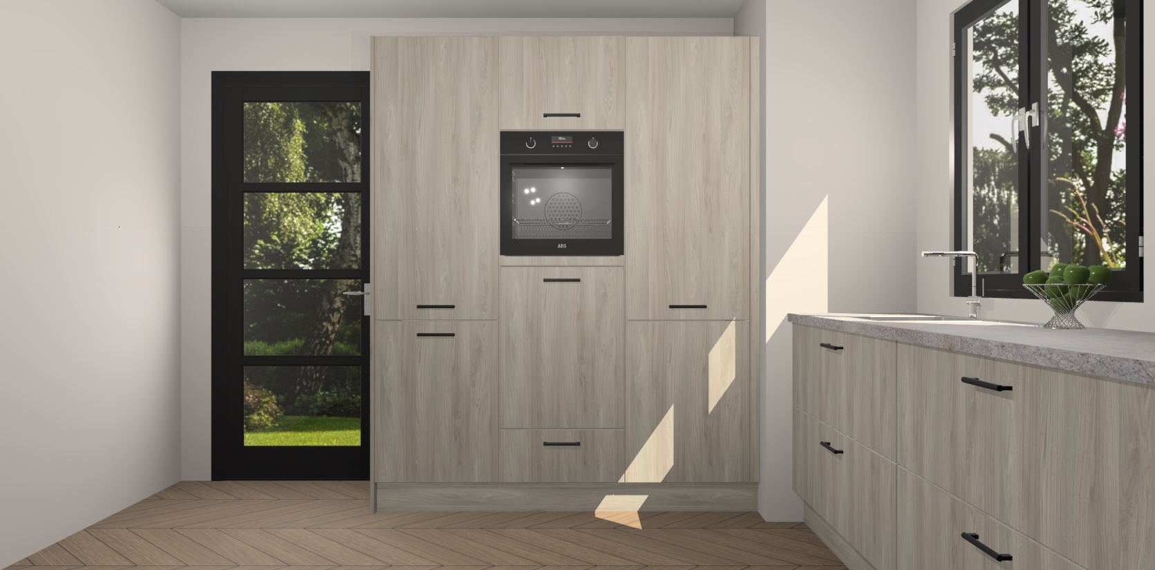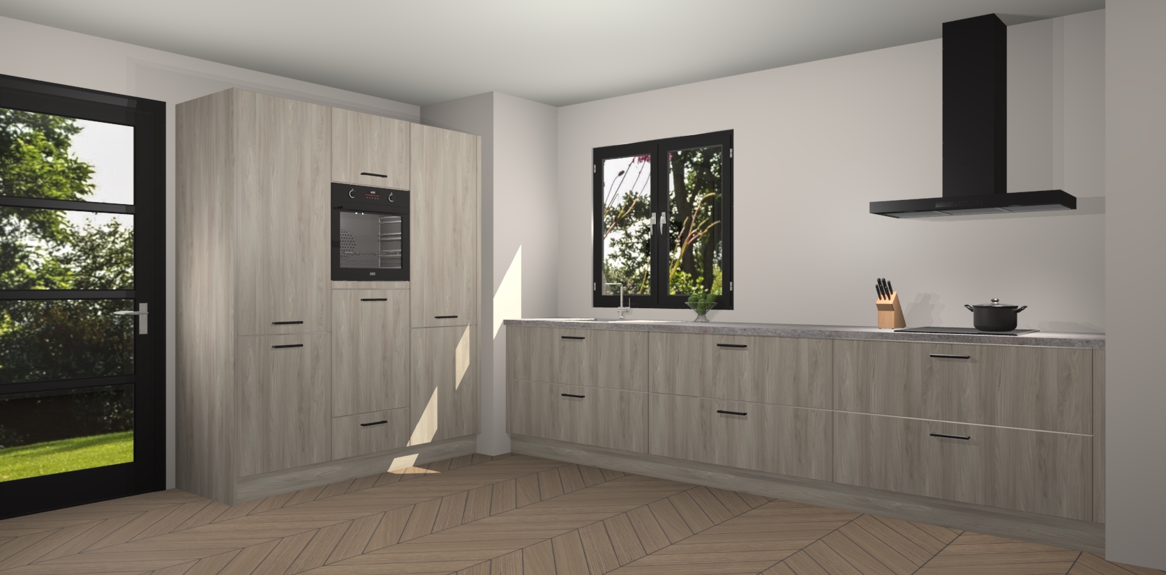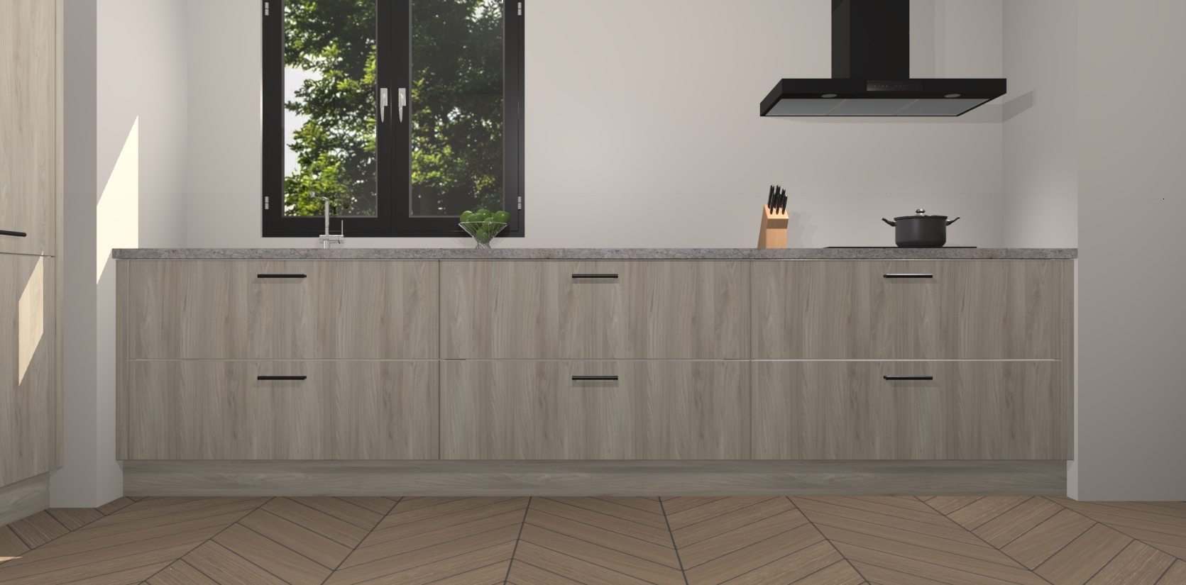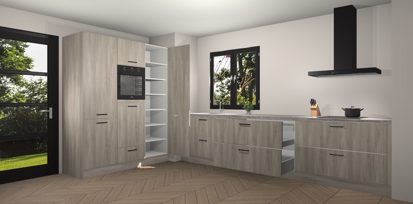 De softclose deuren openen en sluiten is ook heel eenvoudig - geniet van een moeiteloze keukenervaring, zelfs als er kinderen rondlopen. Voor extra gemak bij het plaatsen van uw bestelling bieden we ook een upgrade naar een kookplaat met geïntegreerde afzuiging.