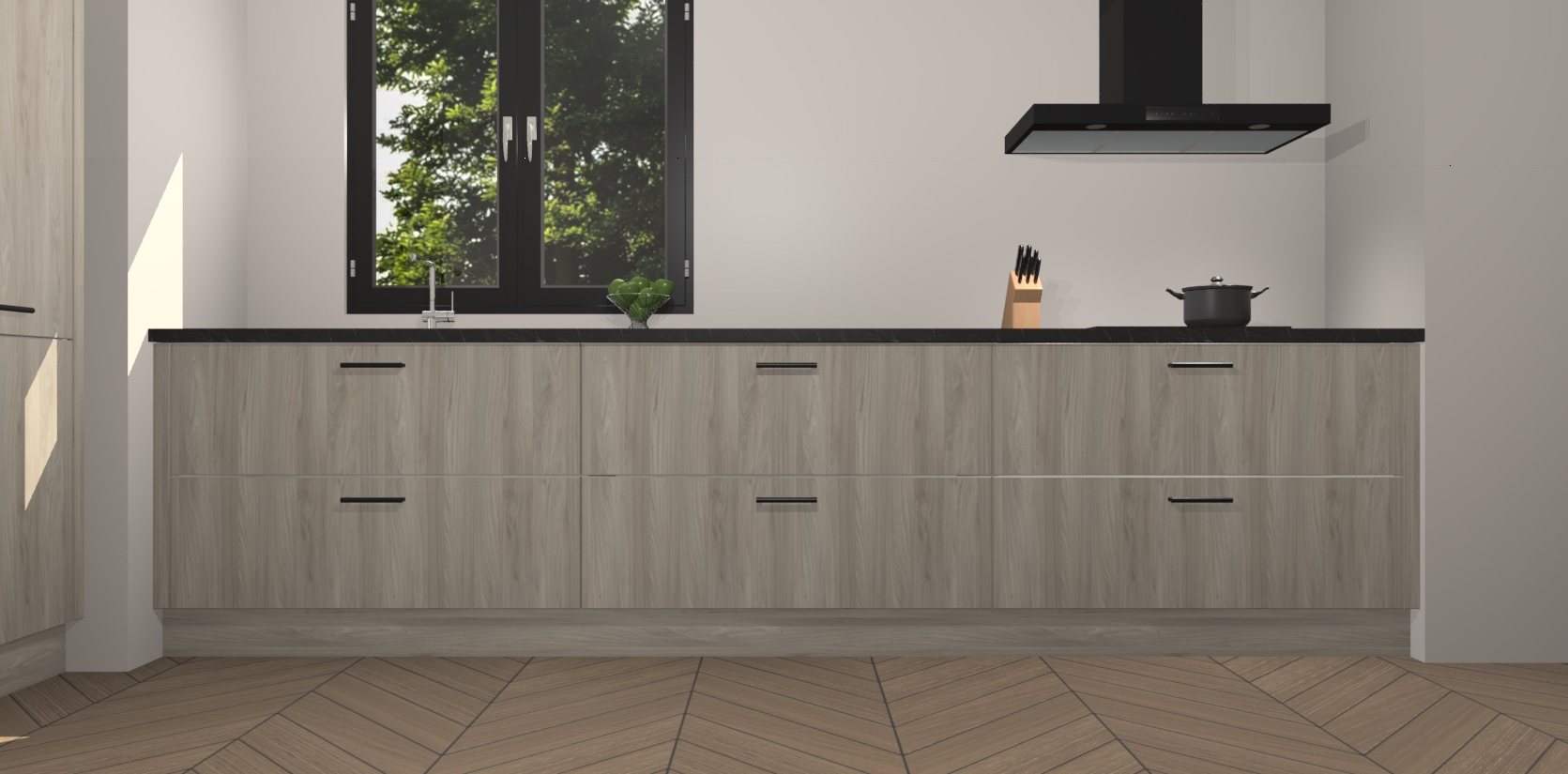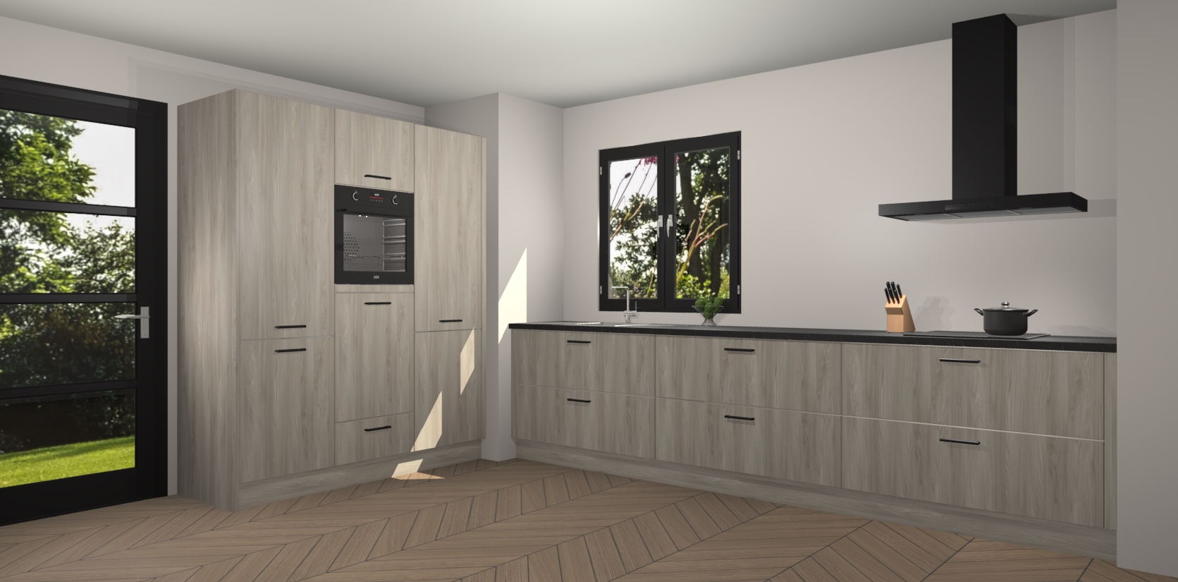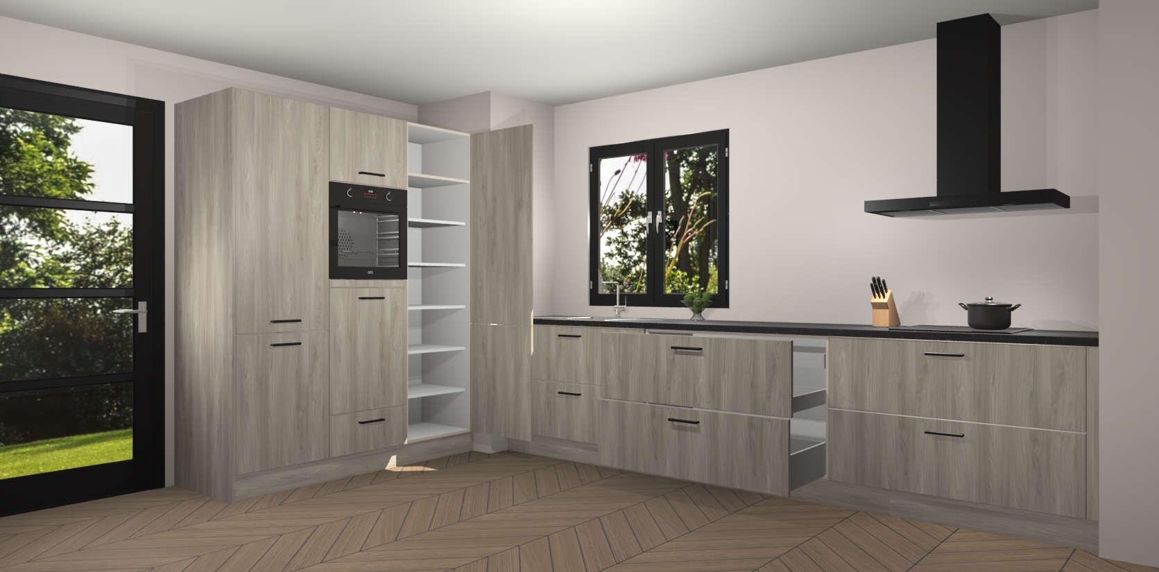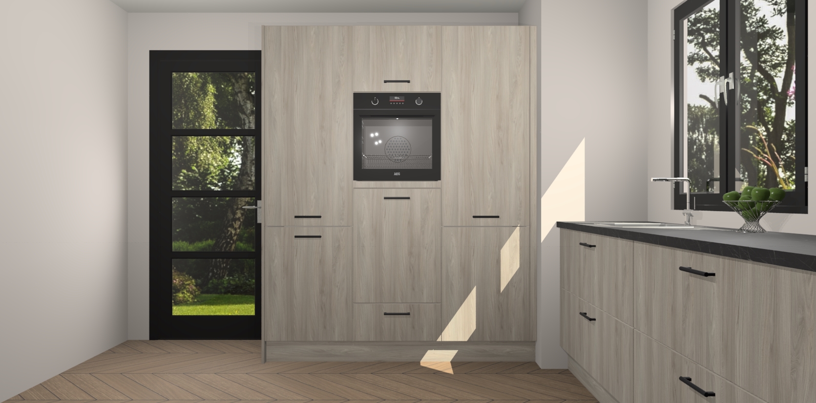 De softclose deuren openen en sluiten is ook heel eenvoudig - geniet van een moeiteloze keukenervaring, zelfs als er kinderen rondlopen. Voor extra gemak bij het plaatsen van uw bestelling bieden we ook een upgrade naar een kookplaat met geïntegreerde afzuiging.