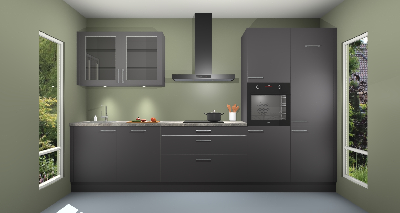 De onyxgrijs keuken Cairo is de perfecte mix van modern en tijdloos design. Met zijn prachtige glazen deuren op de bovenkastjes voegt hij echt iets speciaals en unieks toe aan elke keuken. En met vijf ingebouwde apparaten inbegrepen - een oven, inductiekookplaat, afzuigkap, vaatwasser en koelkast - kunt u deze keuken echt helemaal van uzelf maken! U kunt na bestelling ook upgraden naar AEG voor een nog hogere kwaliteitservaring.