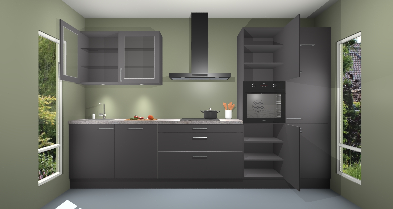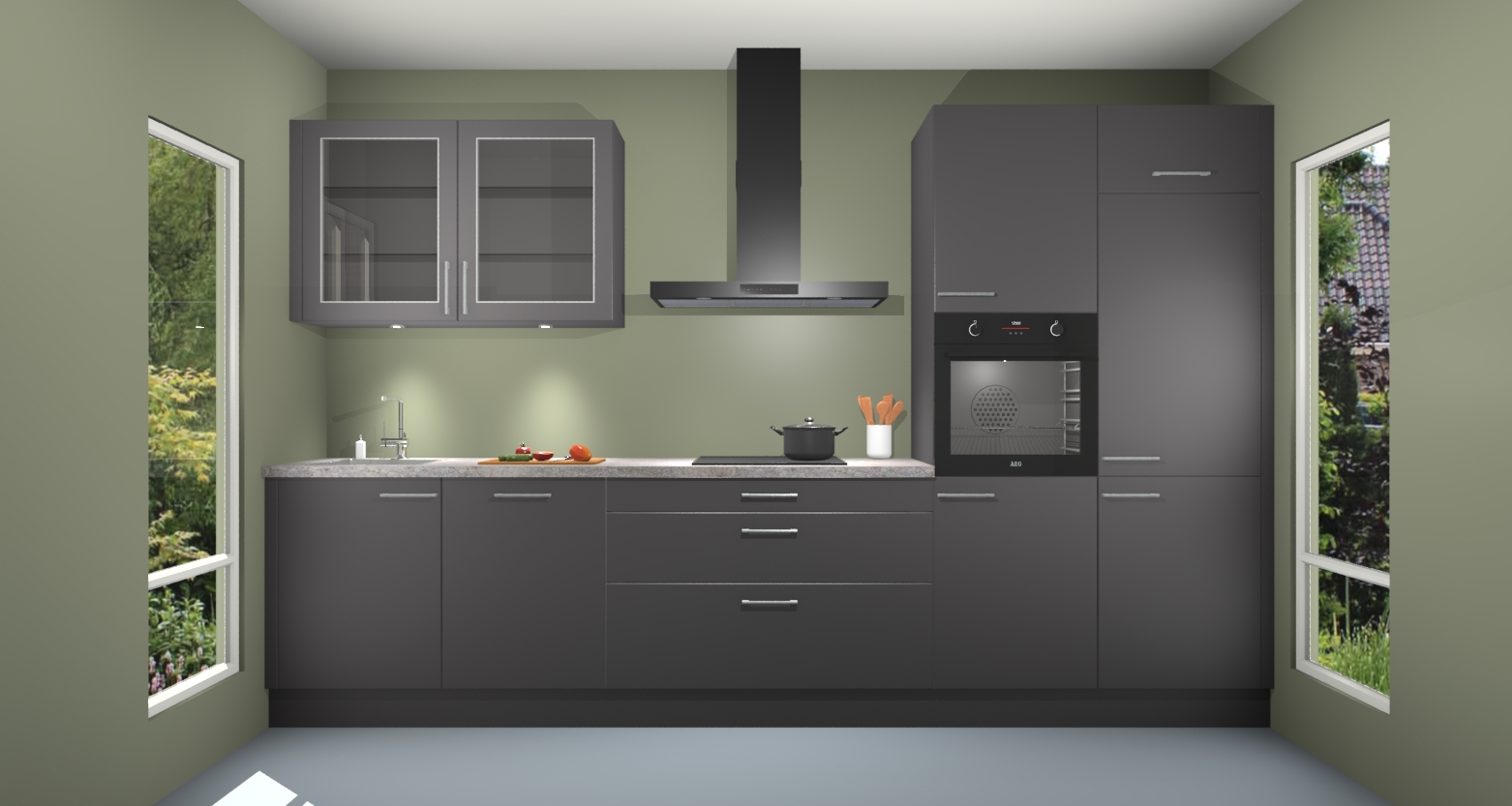 De onyxgrijs keuken Cairo is de perfecte mix van modern en tijdloos design. Met zijn prachtige glazen deuren op de bovenkastjes voegt hij echt iets speciaals en unieks toe aan elke keuken. En met vijf ingebouwde apparaten inbegrepen - een oven, inductiekookplaat, afzuigkap, vaatwasser en koelkast - kunt u deze keuken echt helemaal van uzelf maken! U kunt na bestelling ook upgraden naar AEG voor een nog hogere kwaliteitservaring.