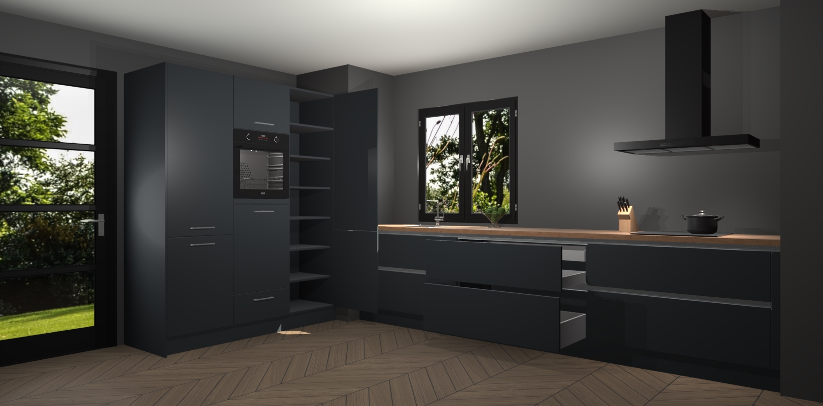 De softclose deuren openen en sluiten is ook heel eenvoudig - geniet van een moeiteloze keukenervaring, zelfs als er kinderen rondlopen. Voor extra gemak bij het plaatsen van uw bestelling bieden we ook een upgrade naar een kookplaat met geïntegreerde afzuiging.