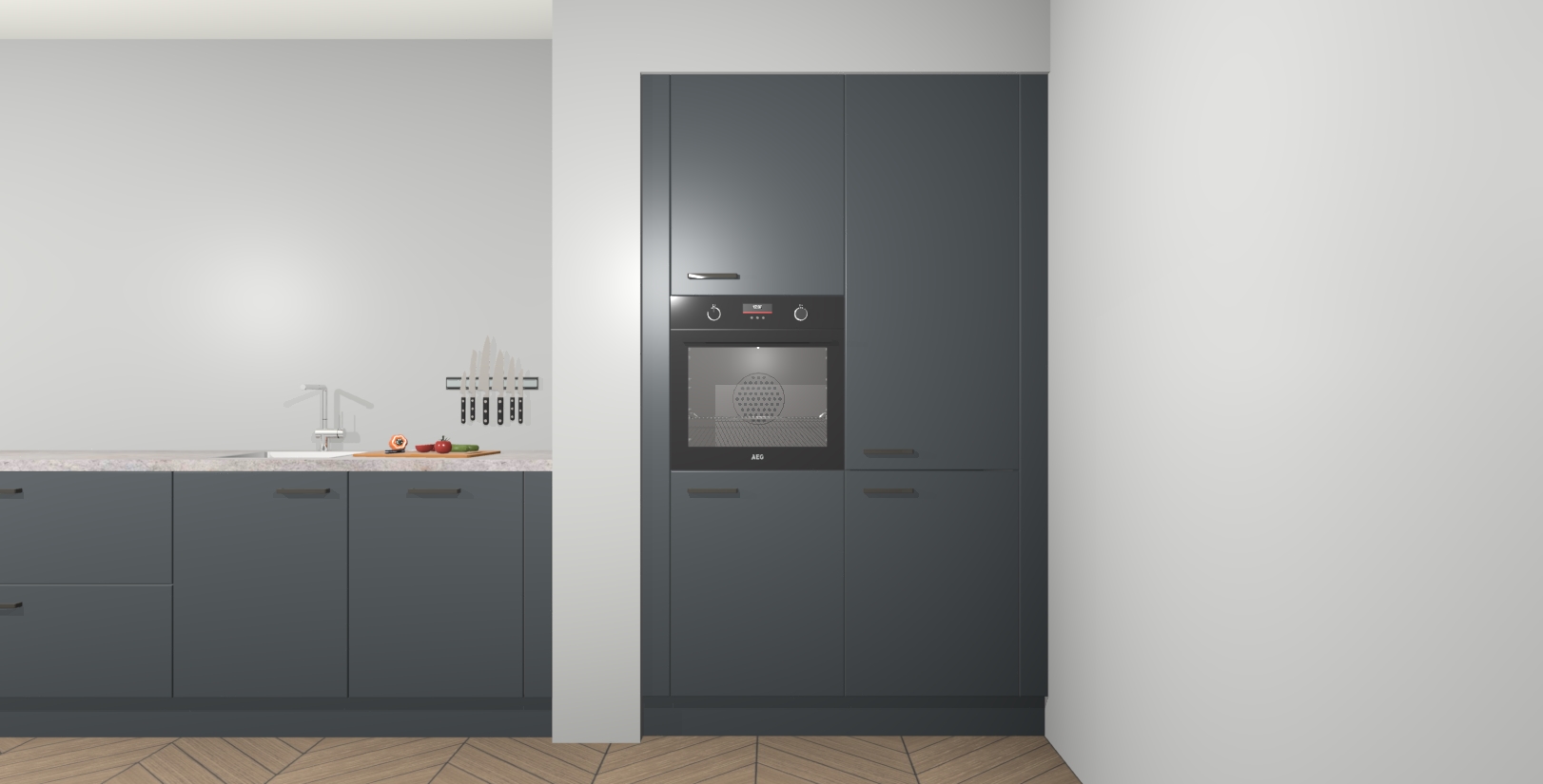 Maak kennis met de Onyxgrijze keuken Calgary - de perfecte aanvulling voor uw moderne keuken! Ervaar tijdloos design, elegantie en een chique uitstraling met onze handgrepen, soft-close deuren en veel opbergruimte. Dit alles wordt aangeboden tegen een vaste lage prijs voor ongeëvenaarde Duitse keukenkwaliteit!