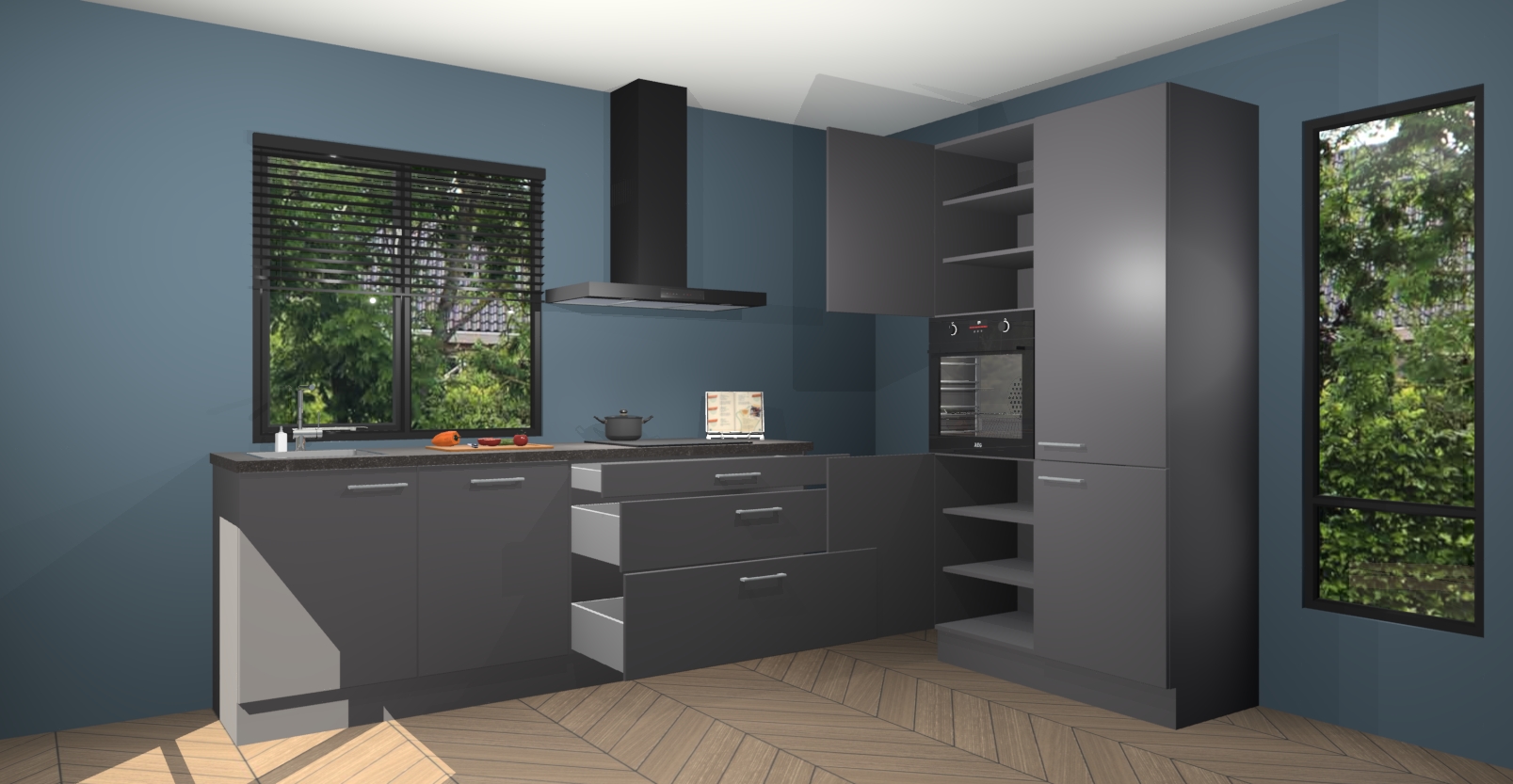 De setting is compleet gemaakt door de vijf inbouwapparaten: wanneer u gaat bestellen kunt u upgraden naar AEG-apparaten als oven, inductieplaat, afzuigkap, vaatwasser en koelkast. Kiest u voor onze Onyxgrijze keuken Monaco, dan weet u zeker dat u te maken heeft met Duitse kwaliteit. Bovendien is er altijd sprake van een lage prijs en profiteren we aantrekkelijk leveringstermijn: die bedraagt slechts 7 weken ! Om het extra makkelijk te maken worden de keukenkasten reeds voorgemonteerd geleverd.