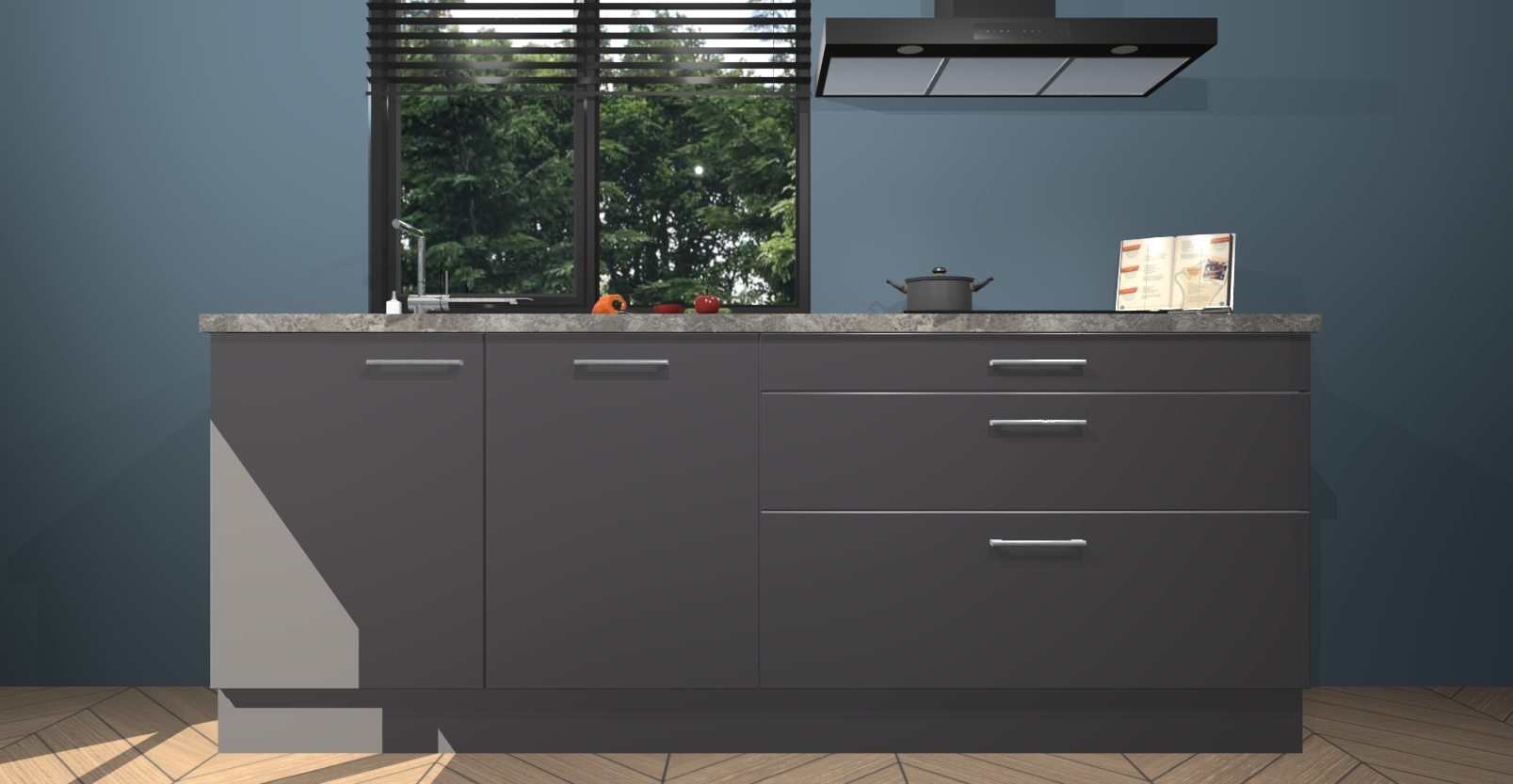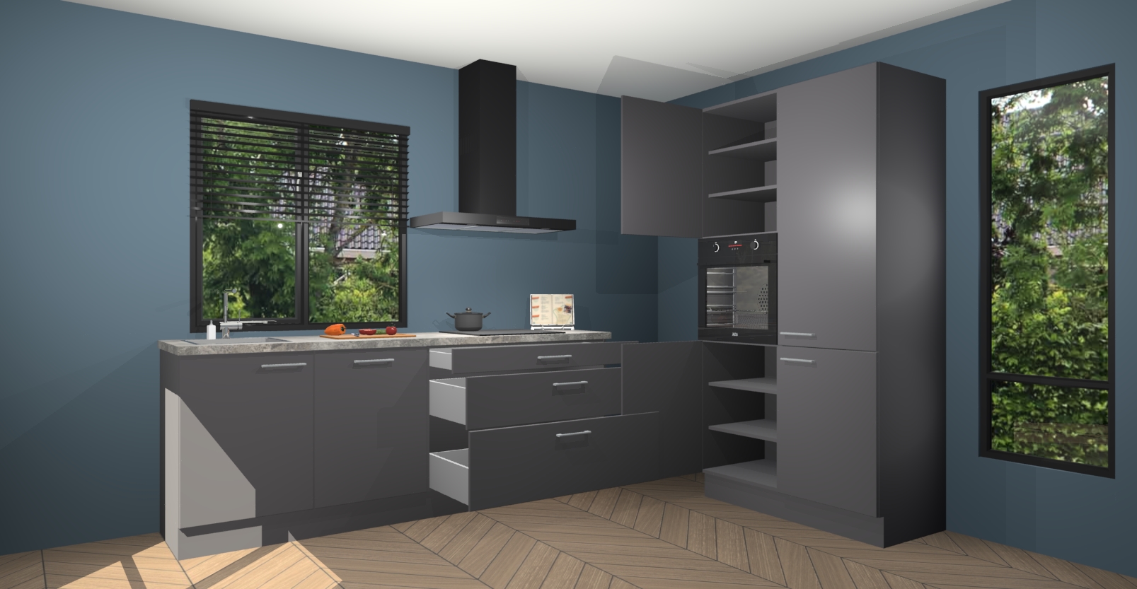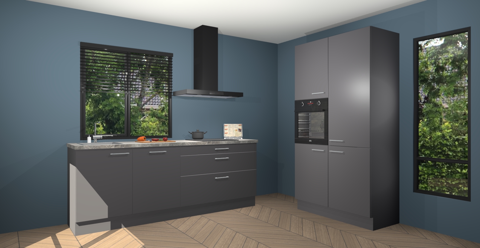 De setting is compleet gemaakt door de vijf inbouwapparaten: wanneer u gaat bestellen kunt u upgraden naar AEG-apparaten als oven, inductieplaat, afzuigkap, vaatwasser en koelkast. Kiest u voor onze Onyxgrijze keuken Monaco, dan weet u zeker dat u te maken heeft met Duitse kwaliteit. Bovendien is er altijd sprake van een lage prijs en profiteren we aantrekkelijk leveringstermijn: die bedraagt slechts 7 weken ! Om het extra makkelijk te maken worden de keukenkasten reeds voorgemonteerd geleverd.