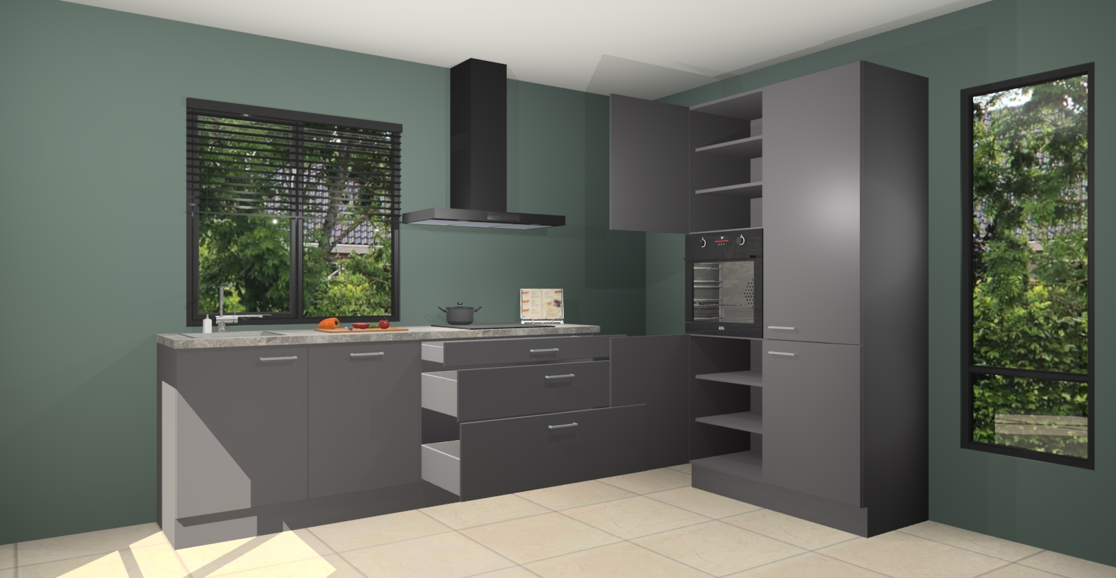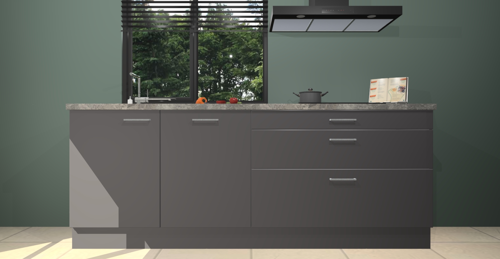 De setting is compleet gemaakt door de vijf inbouwapparaten: wanneer u gaat bestellen kunt u upgraden naar AEG-apparaten als oven, inductieplaat, afzuigkap, vaatwasser en koelkast. Kiest u voor onze Onyxgrijze keuken Monaco, dan weet u zeker dat u te maken heeft met Duitse kwaliteit. Bovendien is er altijd sprake van een lage prijs en profiteren we aantrekkelijk leveringstermijn: die bedraagt slechts 7 weken ! Om het extra makkelijk te maken worden de keukenkasten reeds voorgemonteerd geleverd.