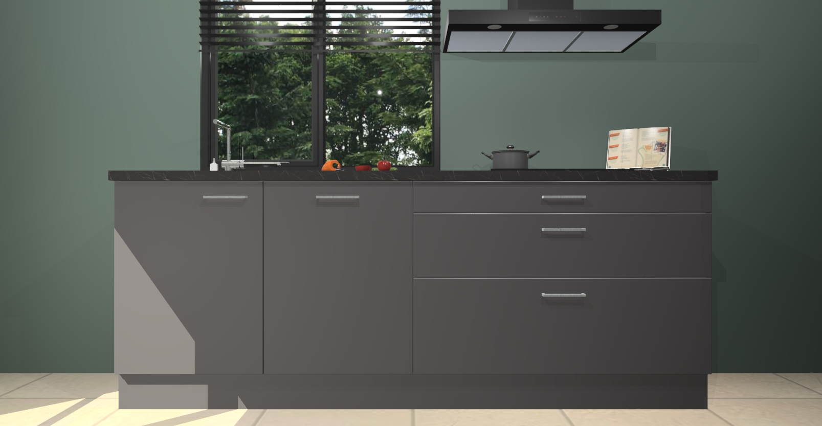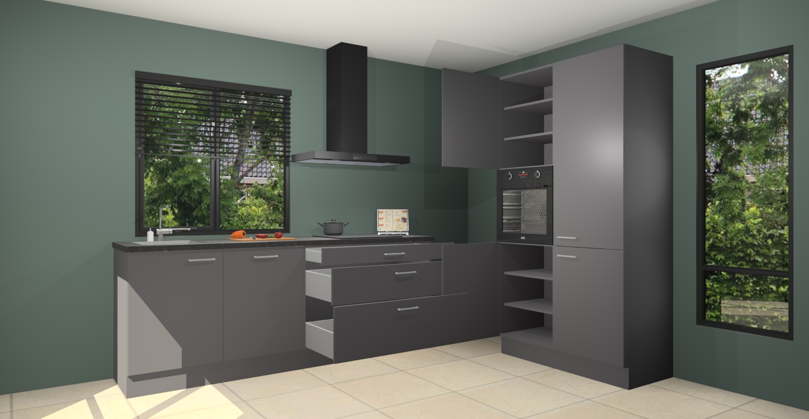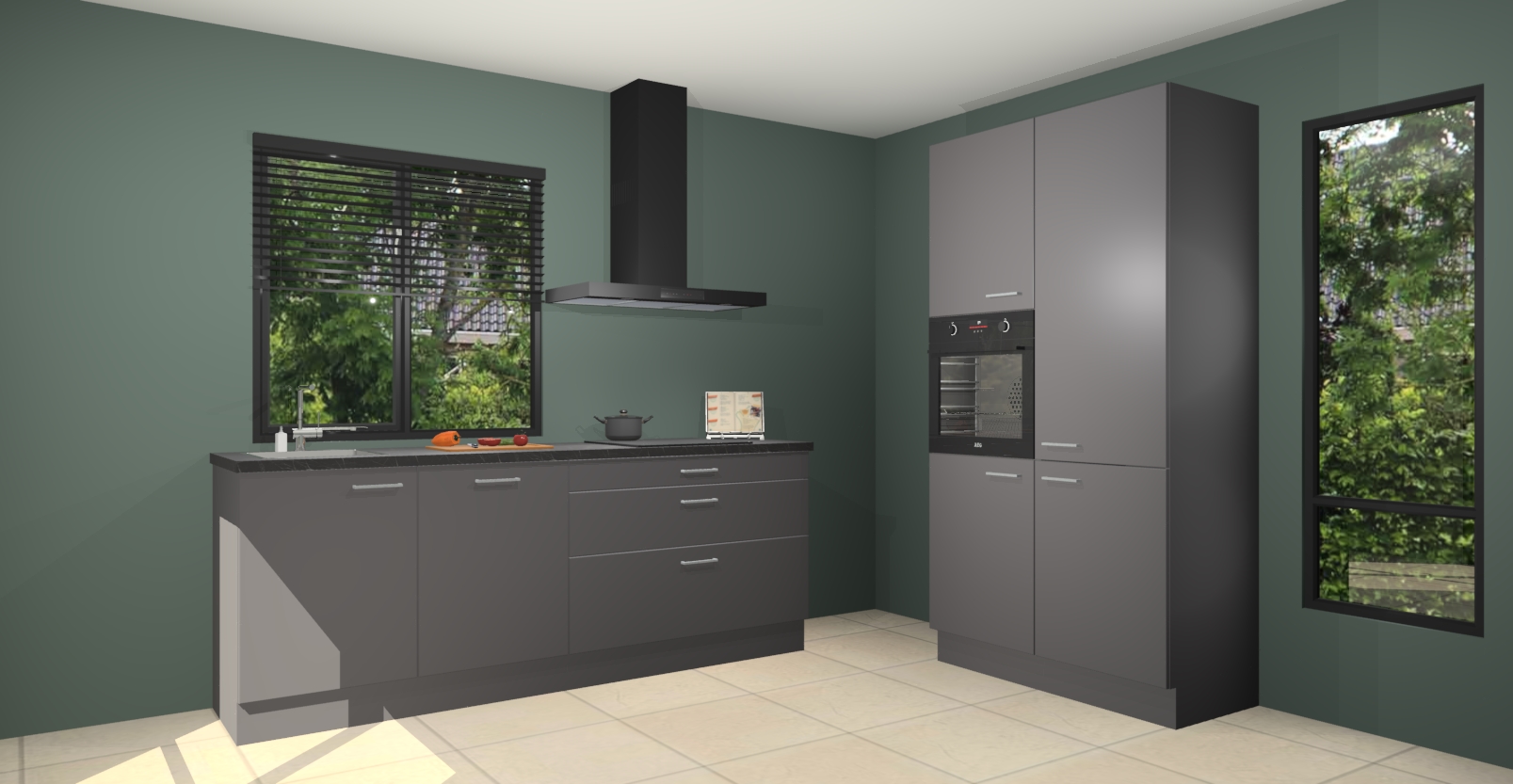 De setting is compleet gemaakt door de vijf inbouwapparaten: wanneer u gaat bestellen kunt u upgraden naar AEG-apparaten als oven, inductieplaat, afzuigkap, vaatwasser en koelkast. Kiest u voor onze Onyxgrijze keuken Monaco, dan weet u zeker dat u te maken heeft met Duitse kwaliteit. Bovendien is er altijd sprake van een lage prijs en profiteren we aantrekkelijk leveringstermijn: die bedraagt slechts 7 weken ! Om het extra makkelijk te maken worden de keukenkasten reeds voorgemonteerd geleverd.