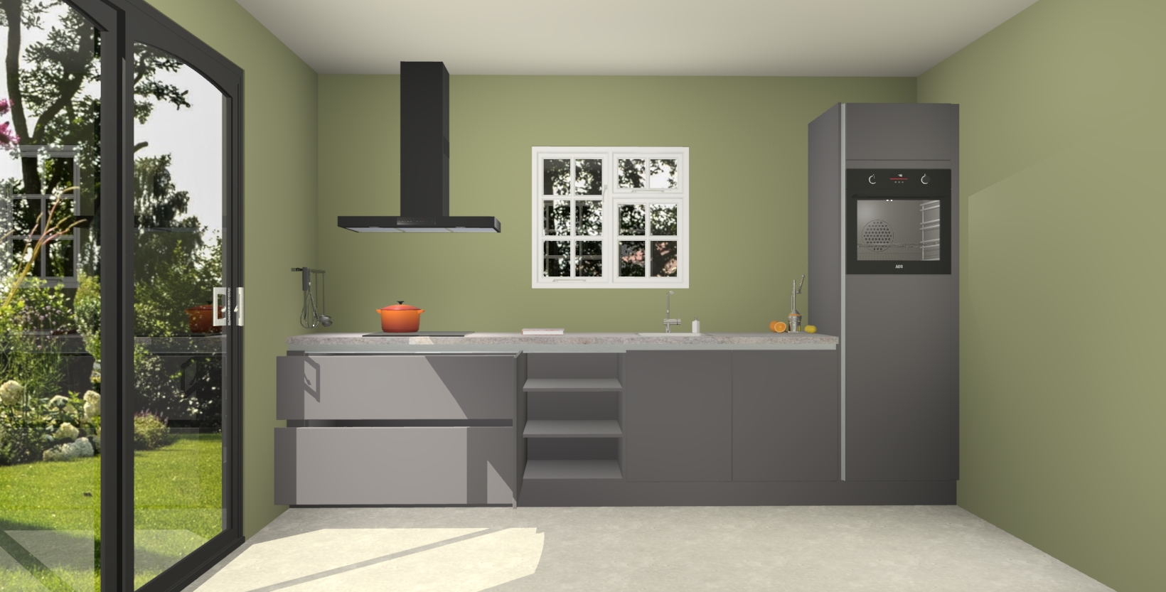 Maak kennis met de onyxgrijze keuken Sofia: de perfecte mix van stijl en gemak. De keuken heeft vijf inbouw apparaten, plus een werkblad in houtlook dat meteen warmte en verfijning toevoegt.