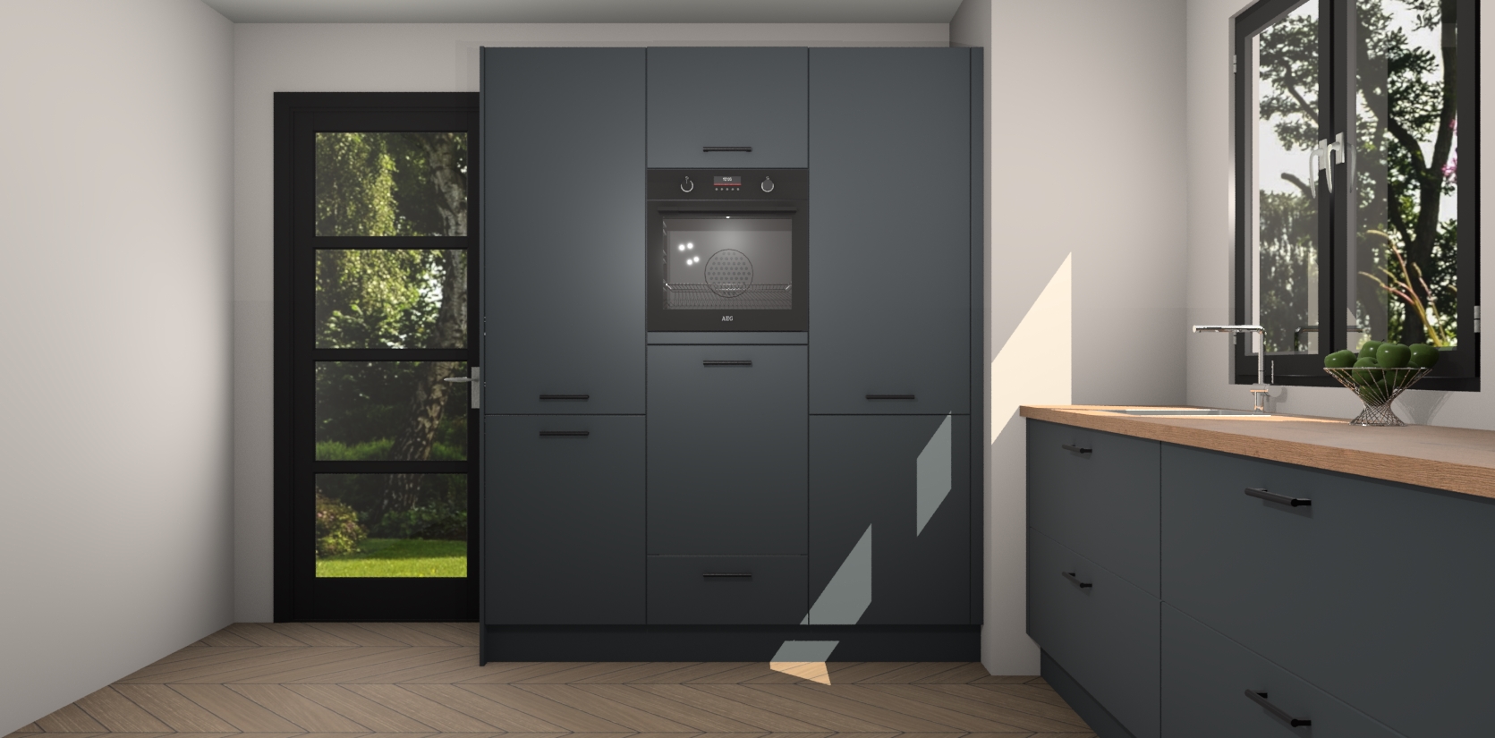 De softclose deuren openen en sluiten is ook heel eenvoudig - geniet van een moeiteloze keukenervaring, zelfs als er kinderen rondlopen. Voor extra gemak bij het plaatsen van uw bestelling bieden we ook een upgrade naar een kookplaat met geïntegreerde afzuiging.