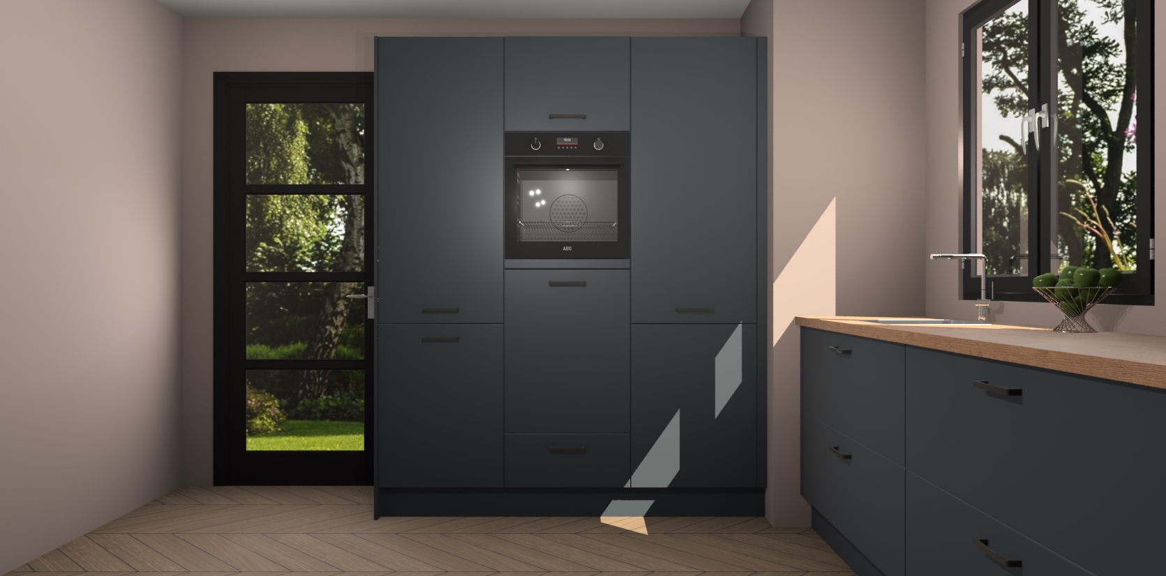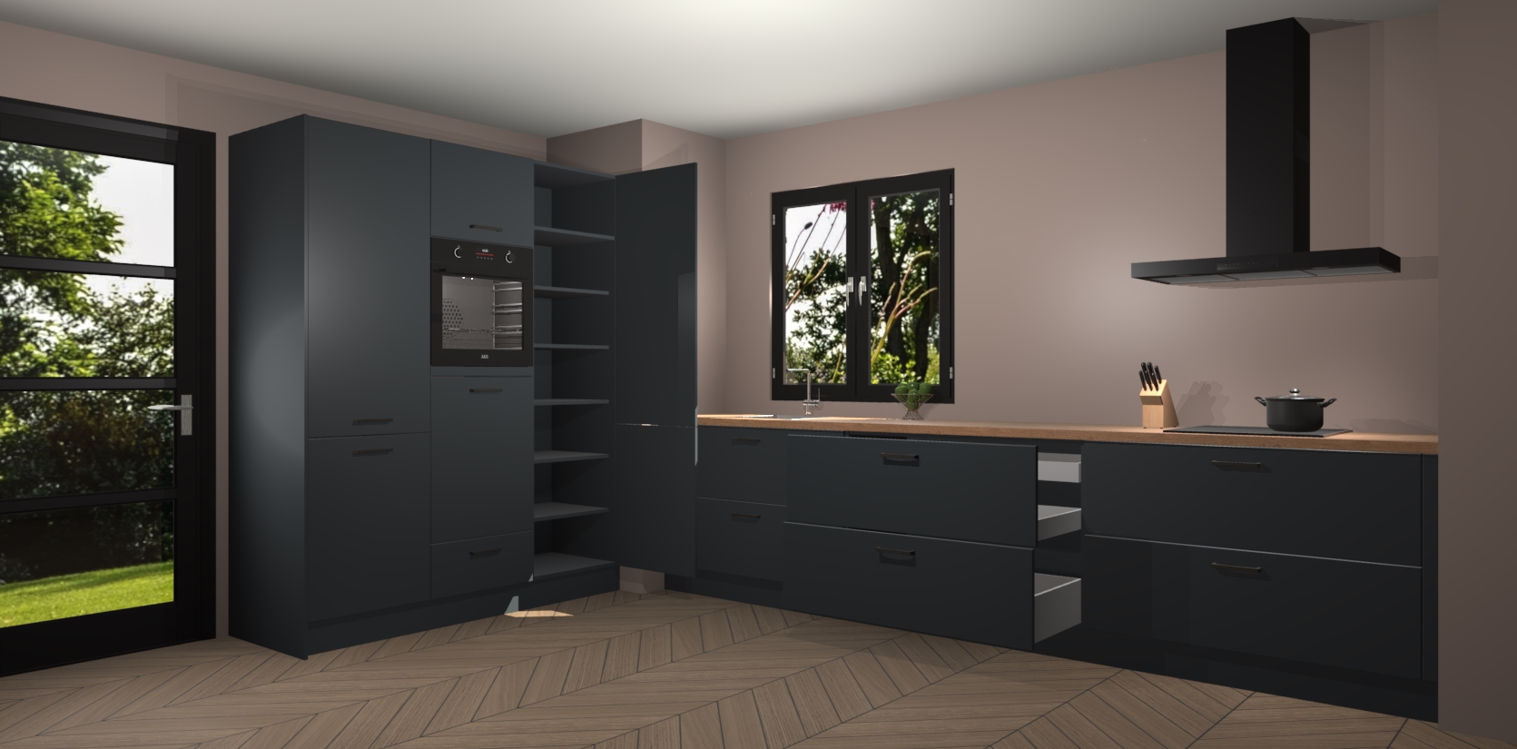 De softclose deuren openen en sluiten is ook heel eenvoudig - geniet van een moeiteloze keukenervaring, zelfs als er kinderen rondlopen. Voor extra gemak bij het plaatsen van uw bestelling bieden we ook een upgrade naar een kookplaat met geïntegreerde afzuiging.