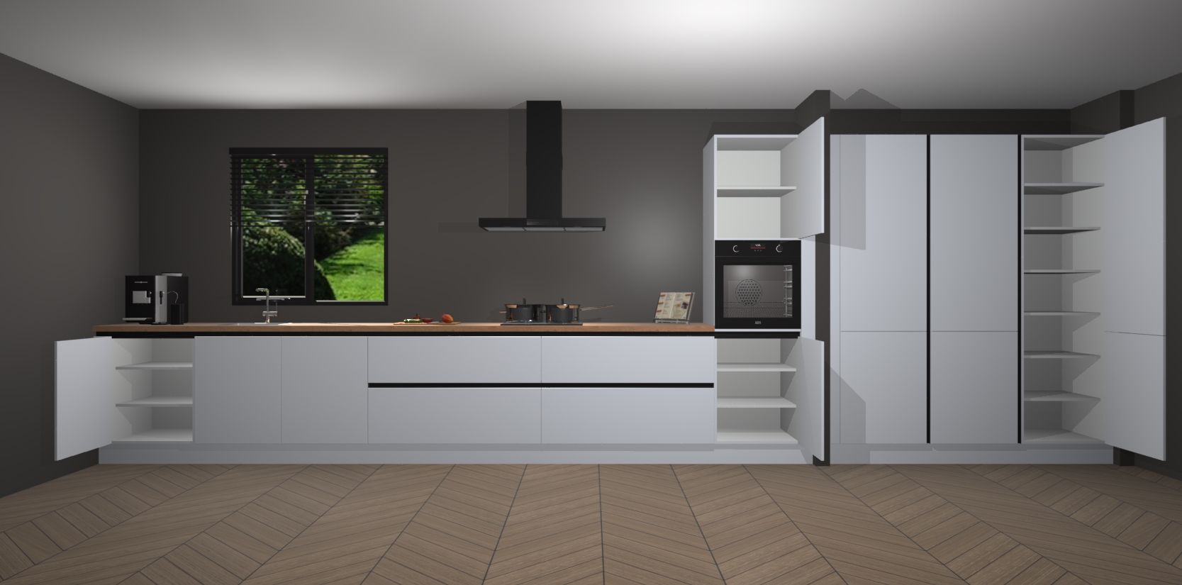 Een stijlvolle en praktische keuken als deze mag gezien worden. Dankzij de prachtige matte afwerking wordt de keuken gemakkelijk het middelpunt van uw huis - hij ziet er geweldig uit onder allerlei lichtomstandigheden, van dag tot nacht!