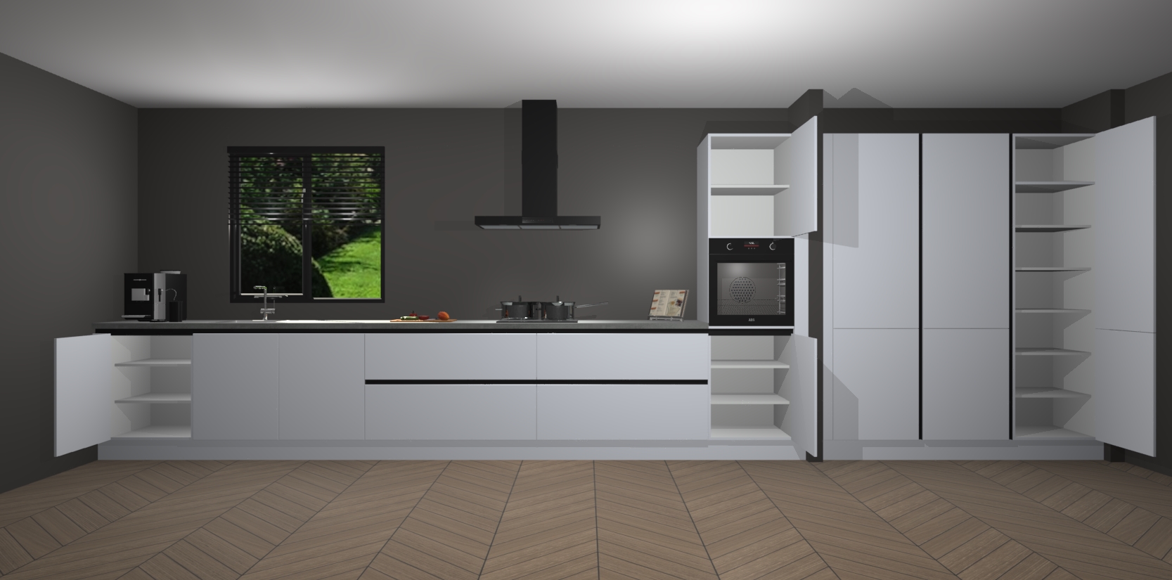 Een stijlvolle en praktische keuken als deze mag gezien worden. Dankzij de prachtige matte afwerking wordt de keuken gemakkelijk het middelpunt van uw huis - hij ziet er geweldig uit onder allerlei lichtomstandigheden, van dag tot nacht!