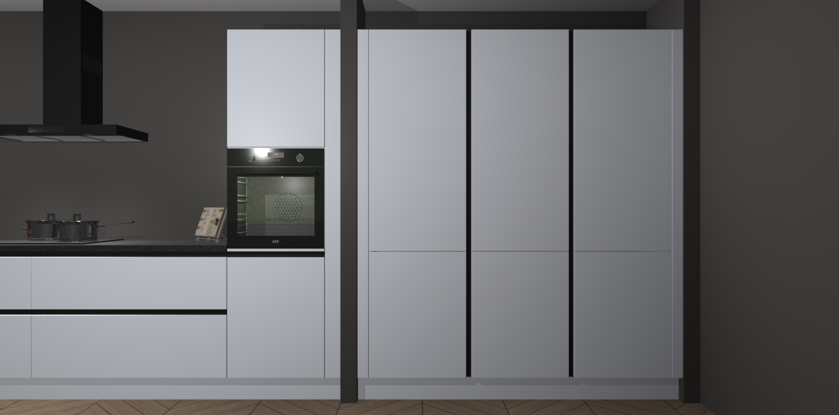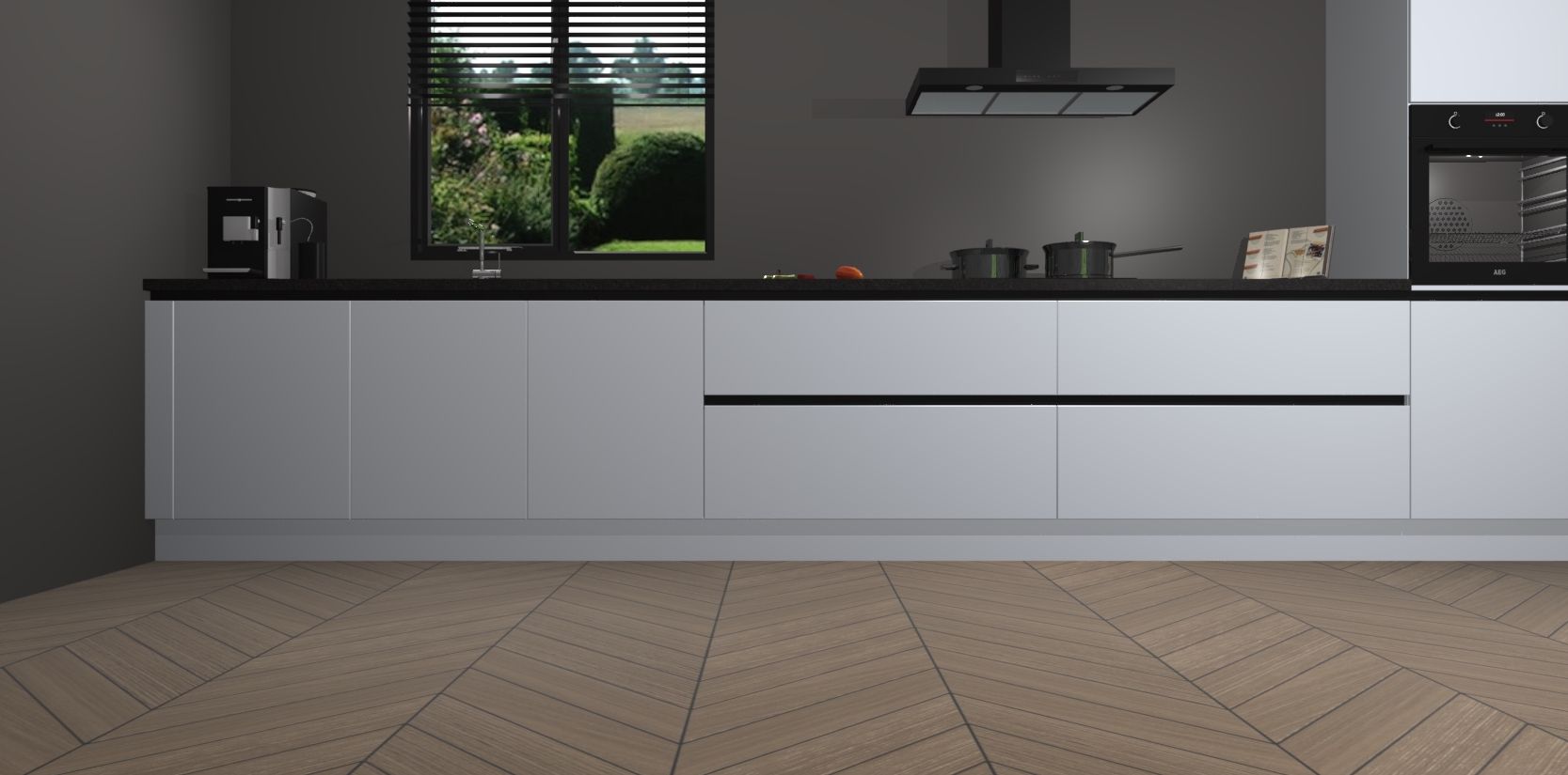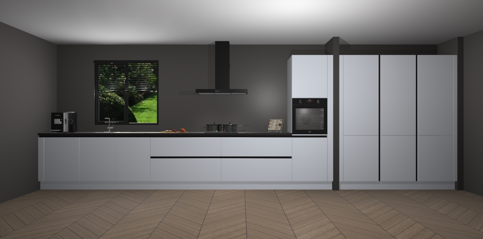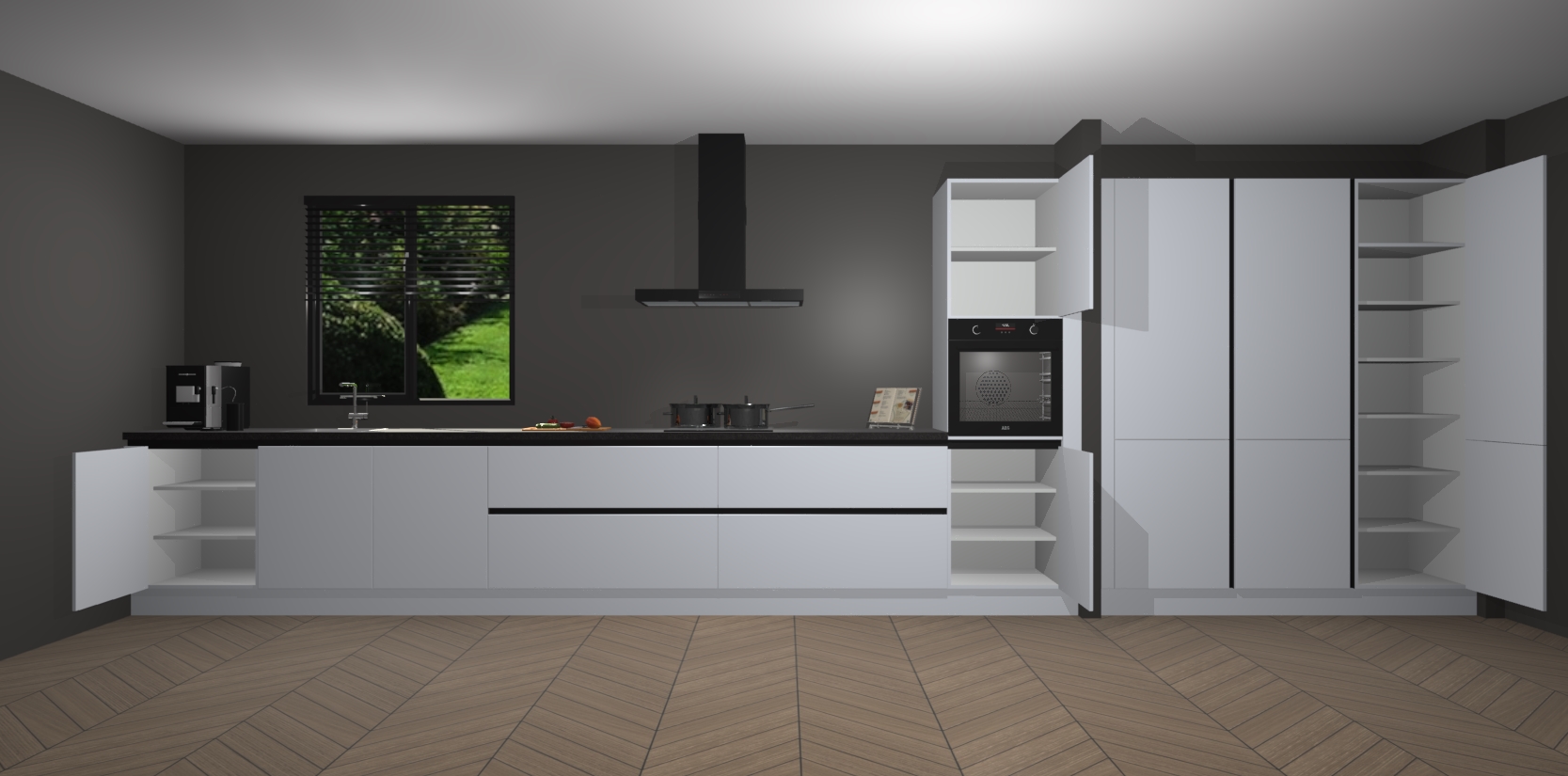 Een stijlvolle en praktische keuken als deze mag gezien worden. Dankzij de prachtige matte afwerking wordt de keuken gemakkelijk het middelpunt van uw huis - hij ziet er geweldig uit onder allerlei lichtomstandigheden, van dag tot nacht!