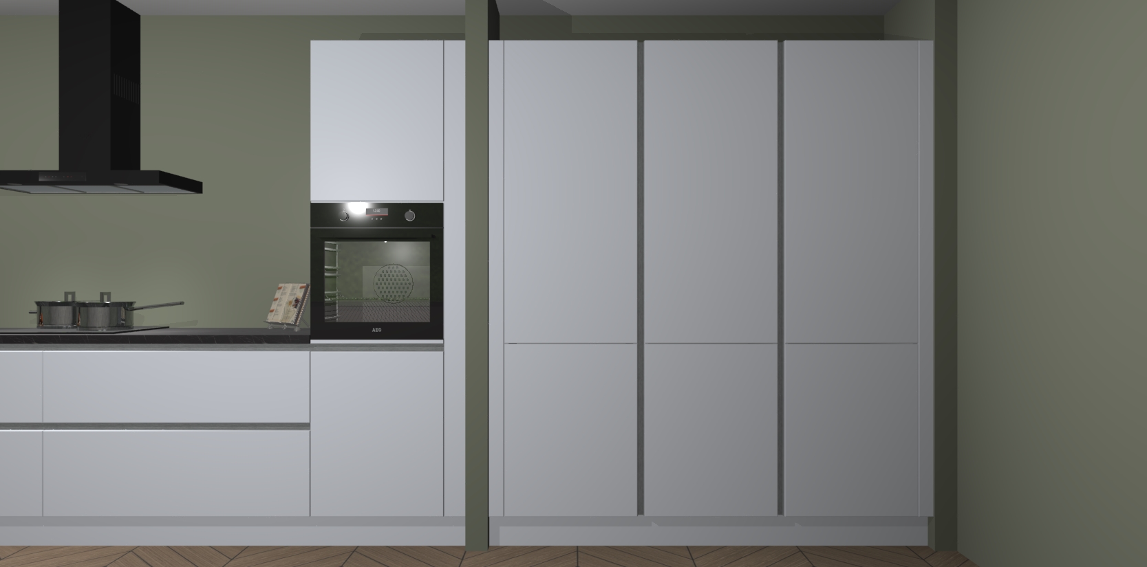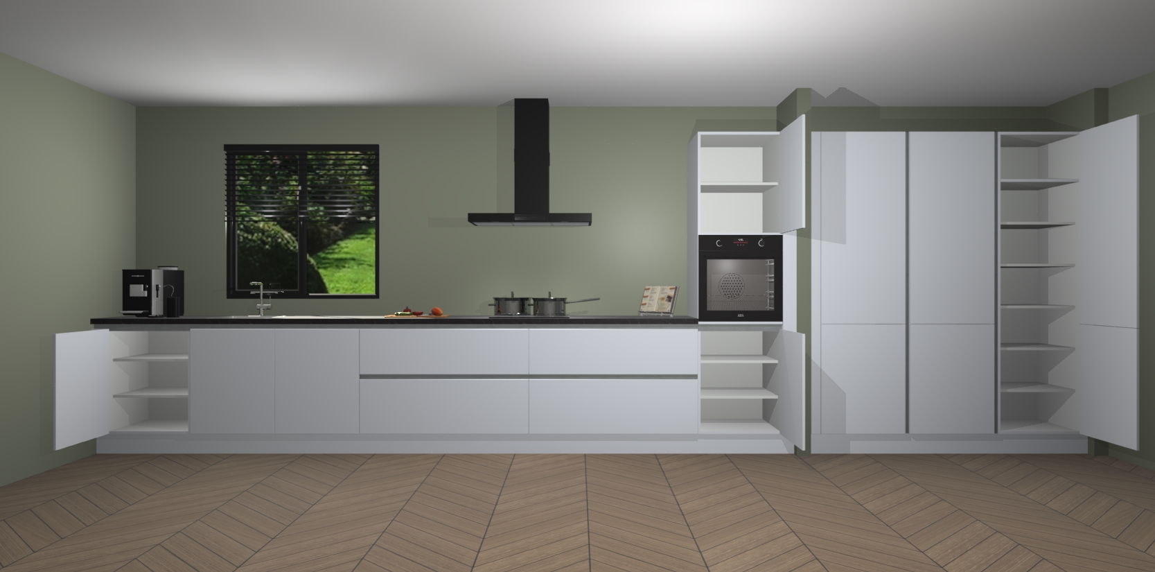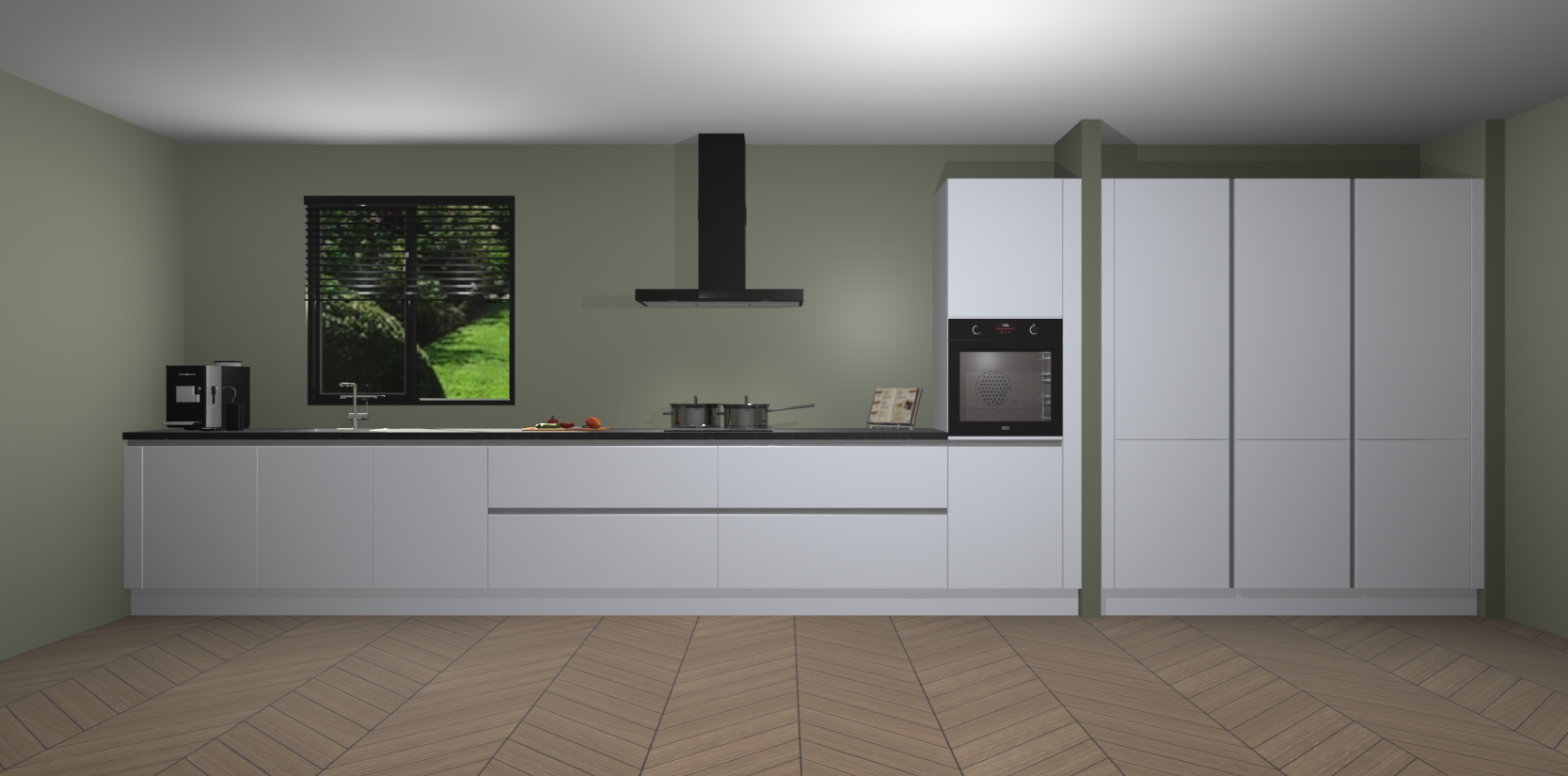 Een stijlvolle en praktische keuken als deze mag gezien worden. Dankzij de prachtige matte afwerking wordt de keuken gemakkelijk het middelpunt van uw huis - hij ziet er geweldig uit onder allerlei lichtomstandigheden, van dag tot nacht!