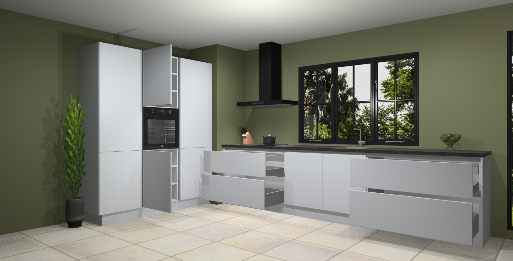 De softclose deuren openen en sluiten is ook heel eenvoudig - geniet van een moeiteloze keukenervaring, zelfs als er kinderen rondlopen. Voor extra gemak bij het plaatsen van uw bestelling bieden we ook een upgrade naar een kookplaat met geïntegreerde afzuiging.
