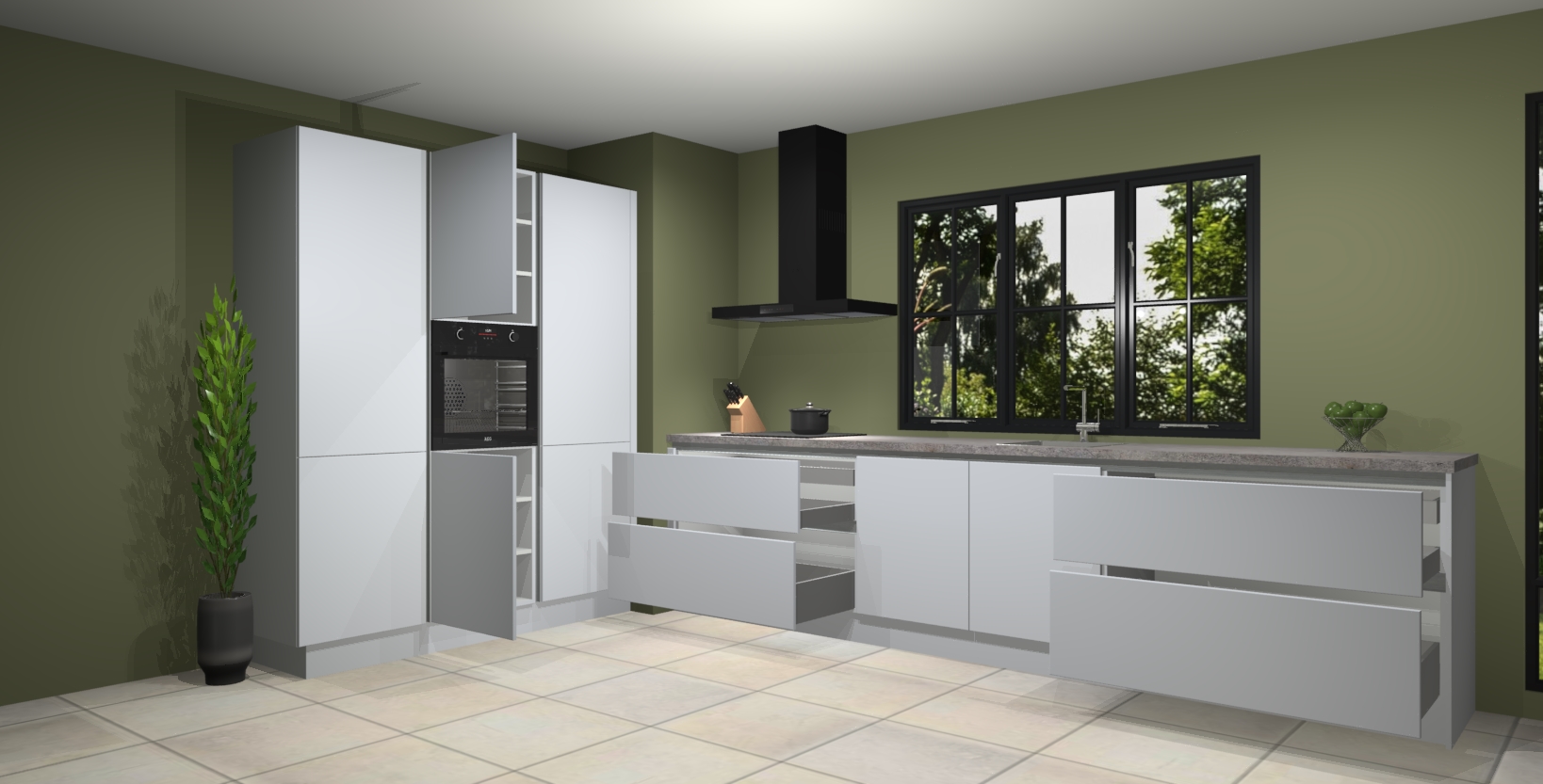 De softclose deuren openen en sluiten is ook heel eenvoudig - geniet van een moeiteloze keukenervaring, zelfs als er kinderen rondlopen. Voor extra gemak bij het plaatsen van uw bestelling bieden we ook een upgrade naar een kookplaat met geïntegreerde afzuiging.