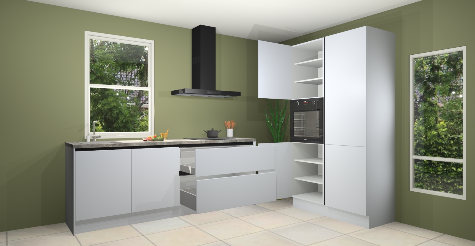 De Sneeuwwitte greeploze keuken Monaco heeft voldoende opbergruimte om uw keukenbenodigdheden georganiseerd en netjes te houden. Geniet van het gemak van de soft-close deuren, die deze stijlvolle look perfect afmaken. Maar dat is nog niet alles. Met de Sneeuwwitte greeploze keuken Monaco krijgt u maar liefst 5 ingebouwde apparaten: een oven, inductiekookplaat, afzuigkap, vaatwasser en koelkast. Deze kunnen gemakkelijk worden geüpgraded naar AEG als ze besteld zijn.