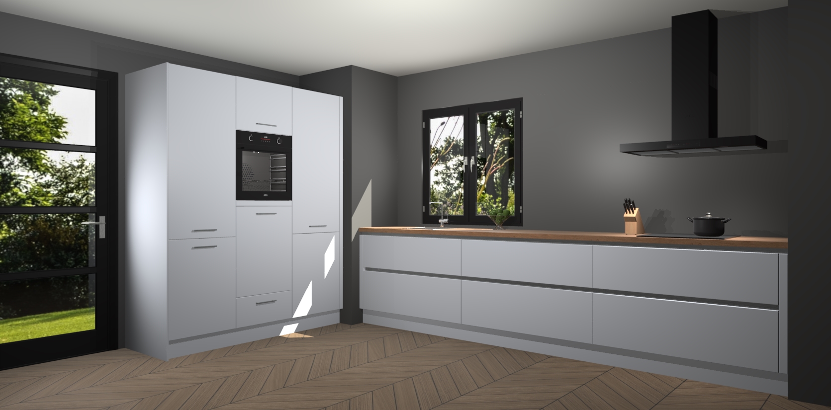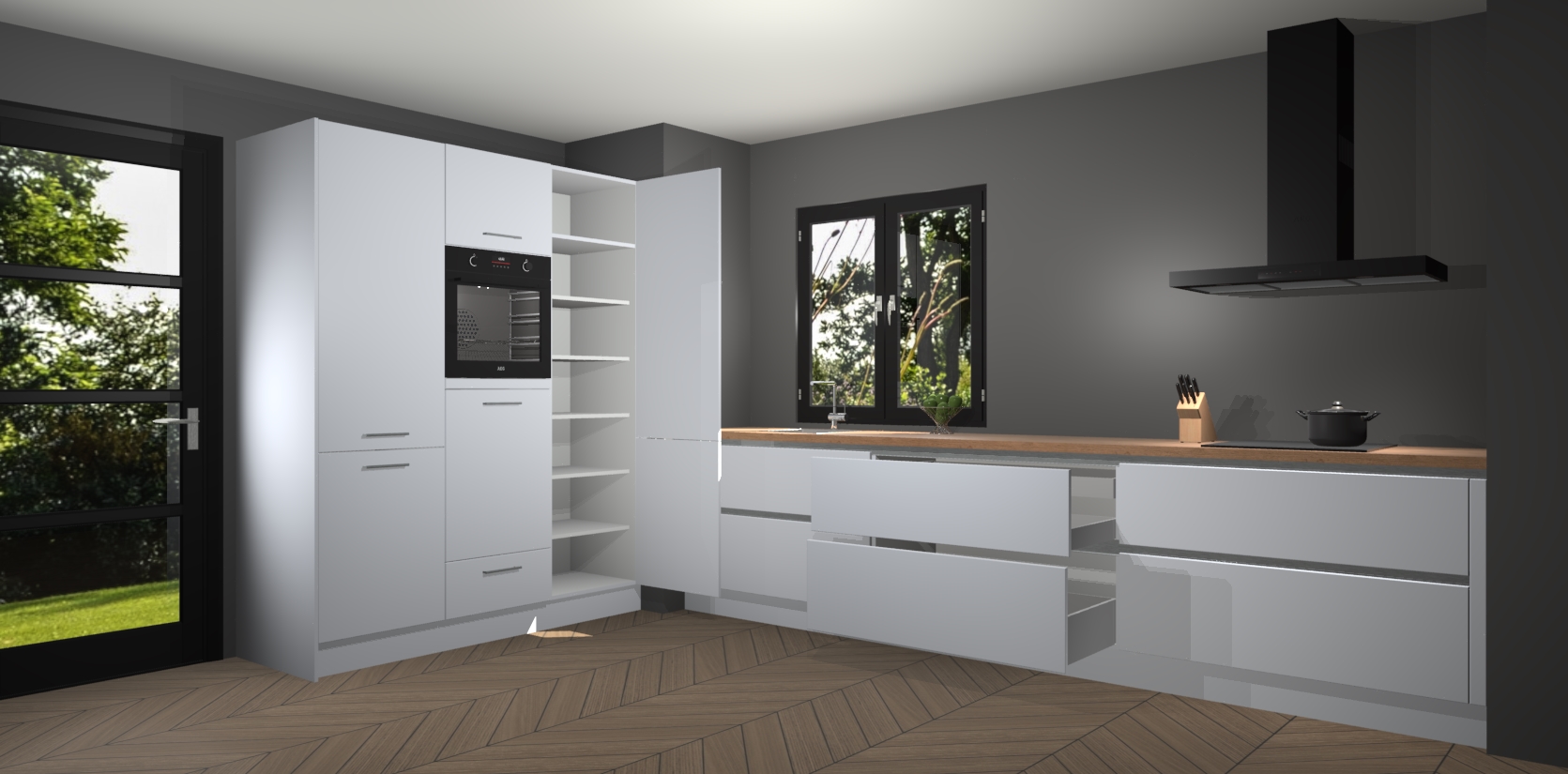 De softclose deuren openen en sluiten is ook heel eenvoudig - geniet van een moeiteloze keukenervaring, zelfs als er kinderen rondlopen. Voor extra gemak bij het plaatsen van uw bestelling bieden we ook een upgrade naar een kookplaat met geïntegreerde afzuiging.