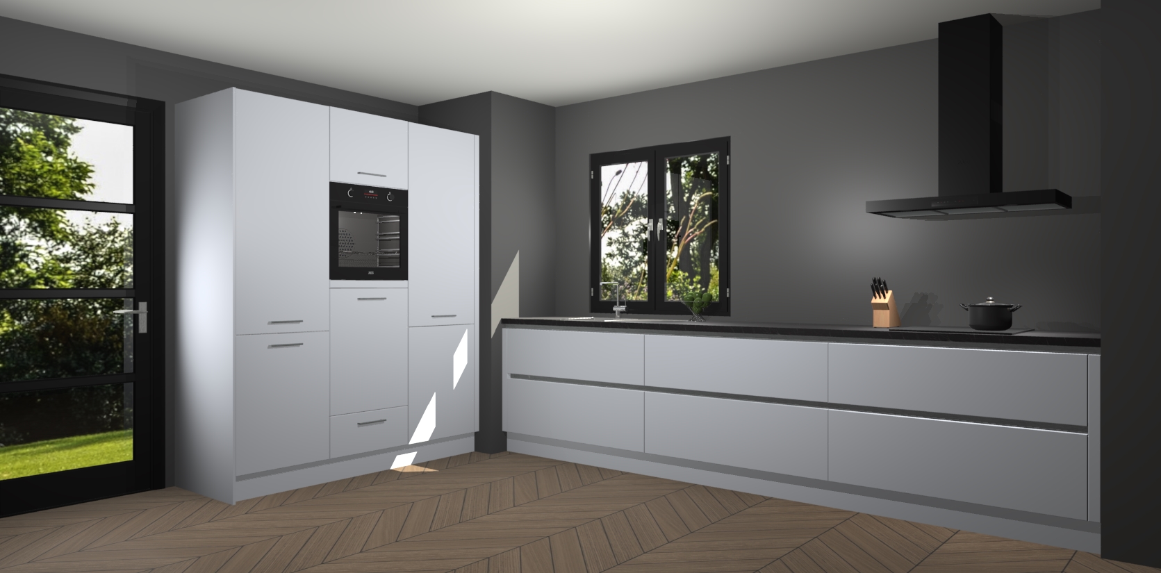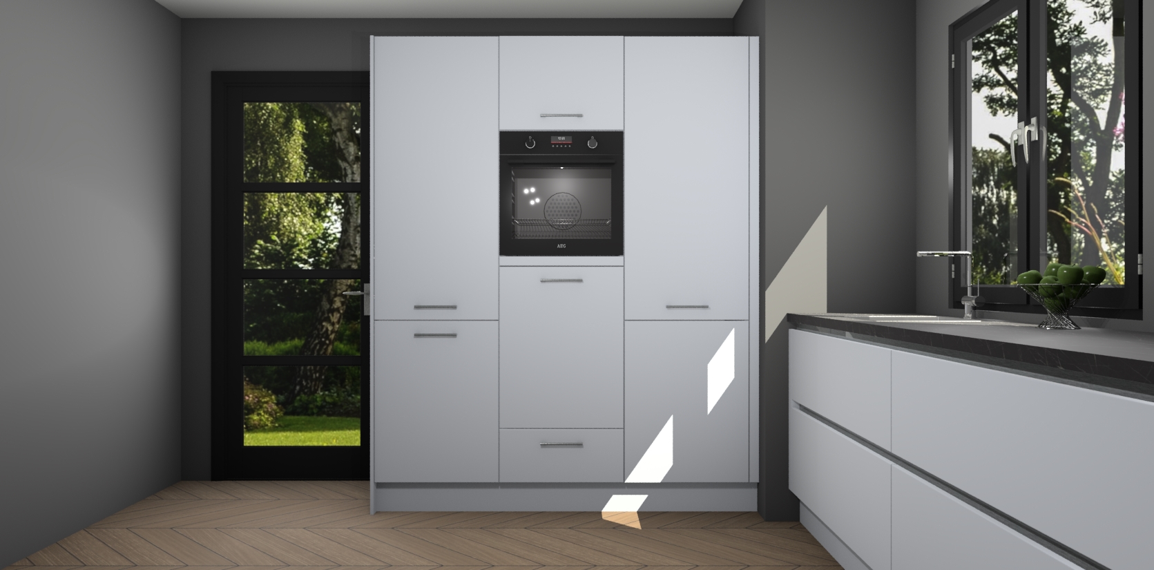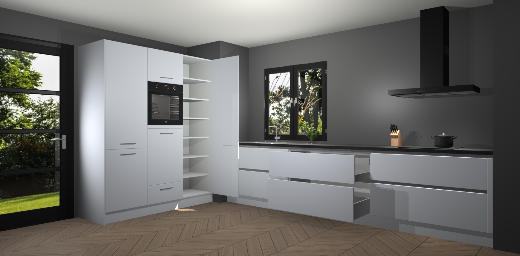 De softclose deuren openen en sluiten is ook heel eenvoudig - geniet van een moeiteloze keukenervaring, zelfs als er kinderen rondlopen. Voor extra gemak bij het plaatsen van uw bestelling bieden we ook een upgrade naar een kookplaat met geïntegreerde afzuiging.