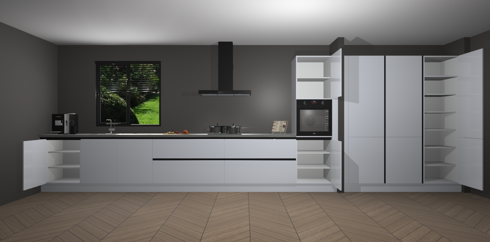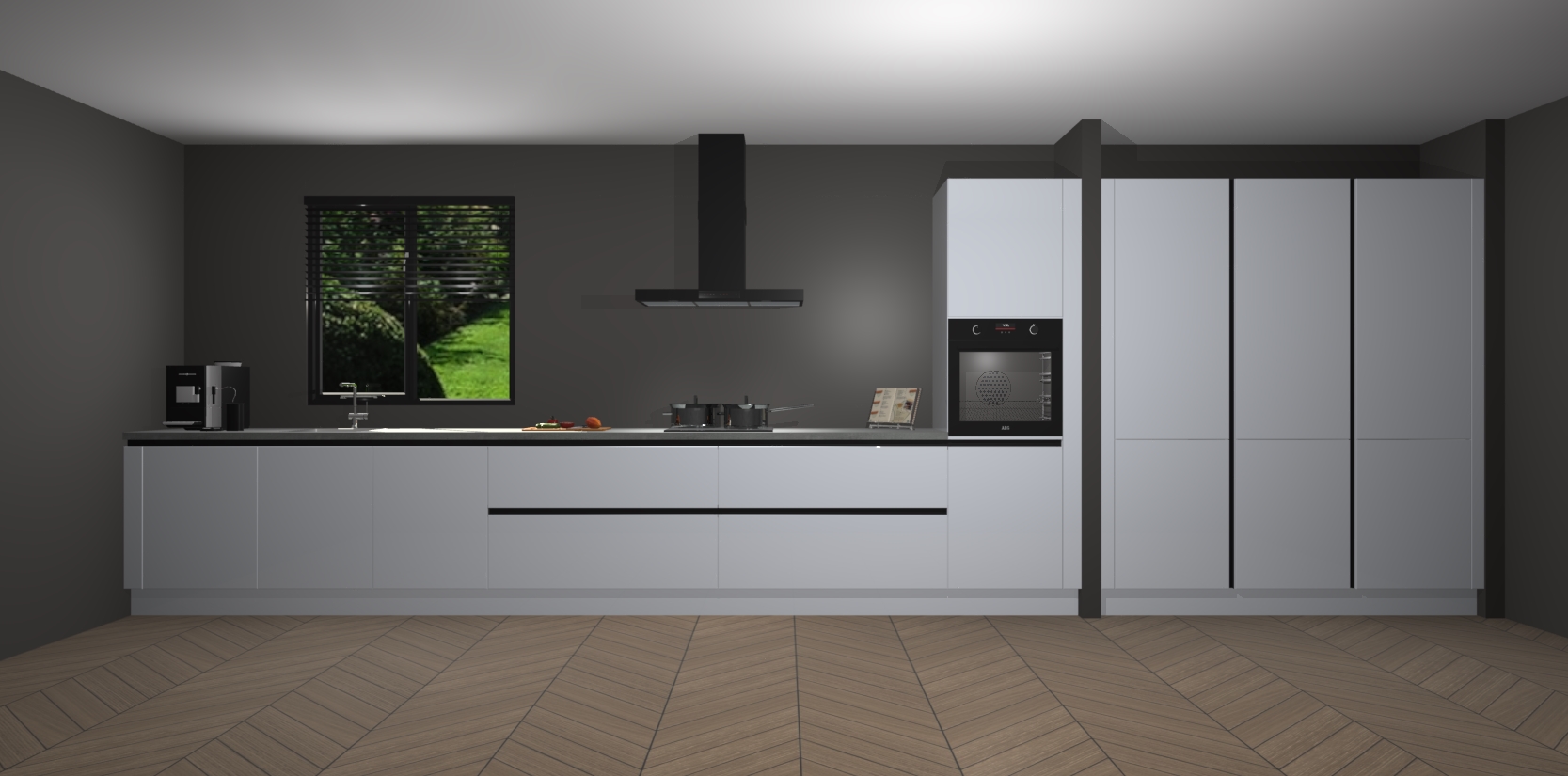 Een stijlvolle en praktische keuken als deze mag gezien worden. Dankzij de prachtige matte afwerking wordt de keuken gemakkelijk het middelpunt van uw huis - hij ziet er geweldig uit onder allerlei lichtomstandigheden, van dag tot nacht!