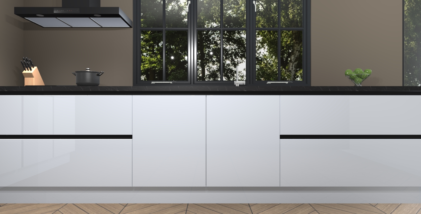 De softclose deuren openen en sluiten is ook heel eenvoudig - geniet van een moeiteloze keukenervaring, zelfs als er kinderen rondlopen. Voor extra gemak bij het plaatsen van uw bestelling bieden we ook een upgrade naar een kookplaat met geïntegreerde afzuiging.