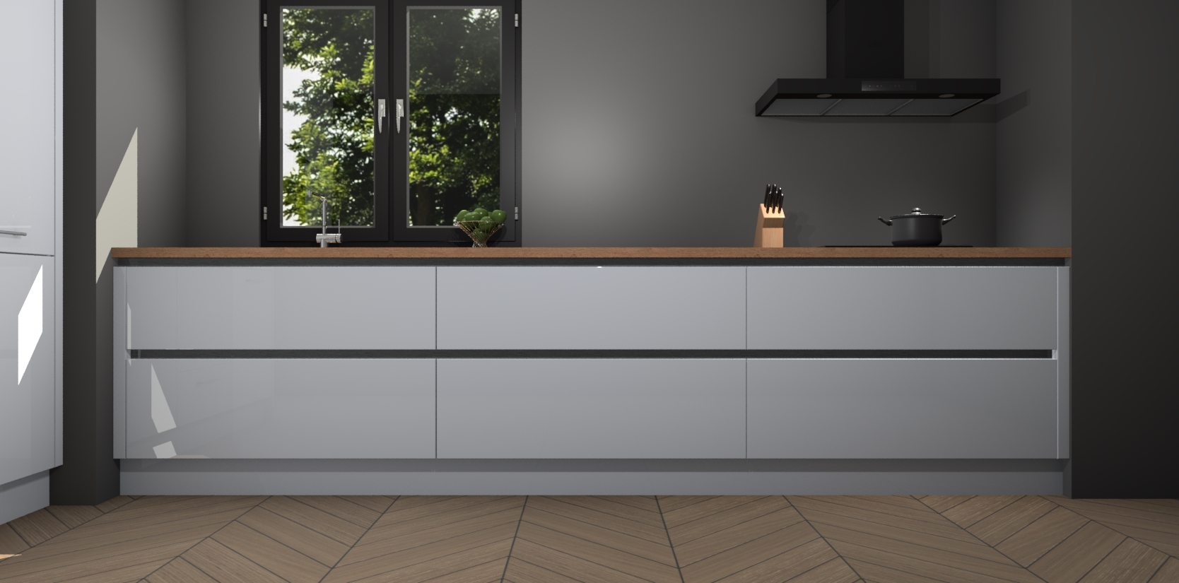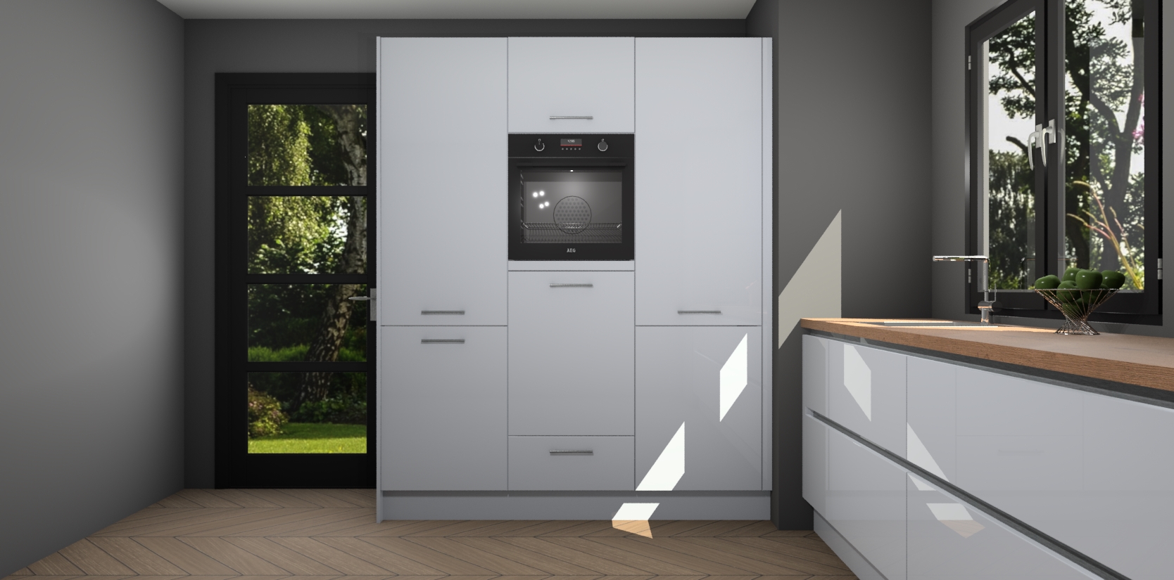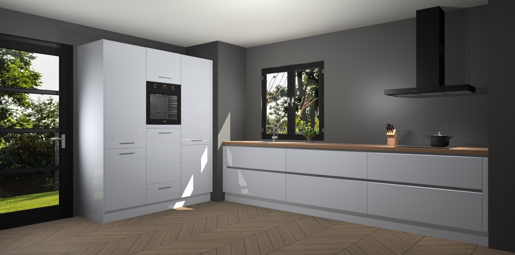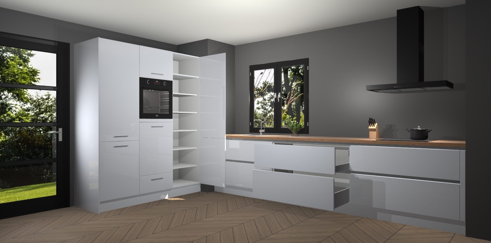 De softclose deuren openen en sluiten is ook heel eenvoudig - geniet van een moeiteloze keukenervaring, zelfs als er kinderen rondlopen. Voor extra gemak bij het plaatsen van uw bestelling bieden we ook een upgrade naar een kookplaat met geïntegreerde afzuiging.