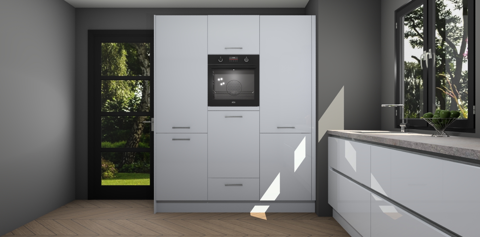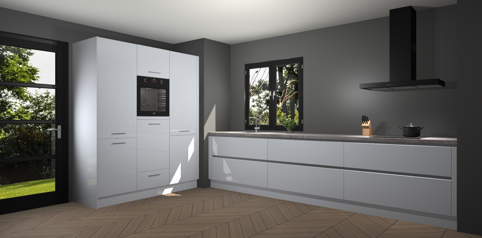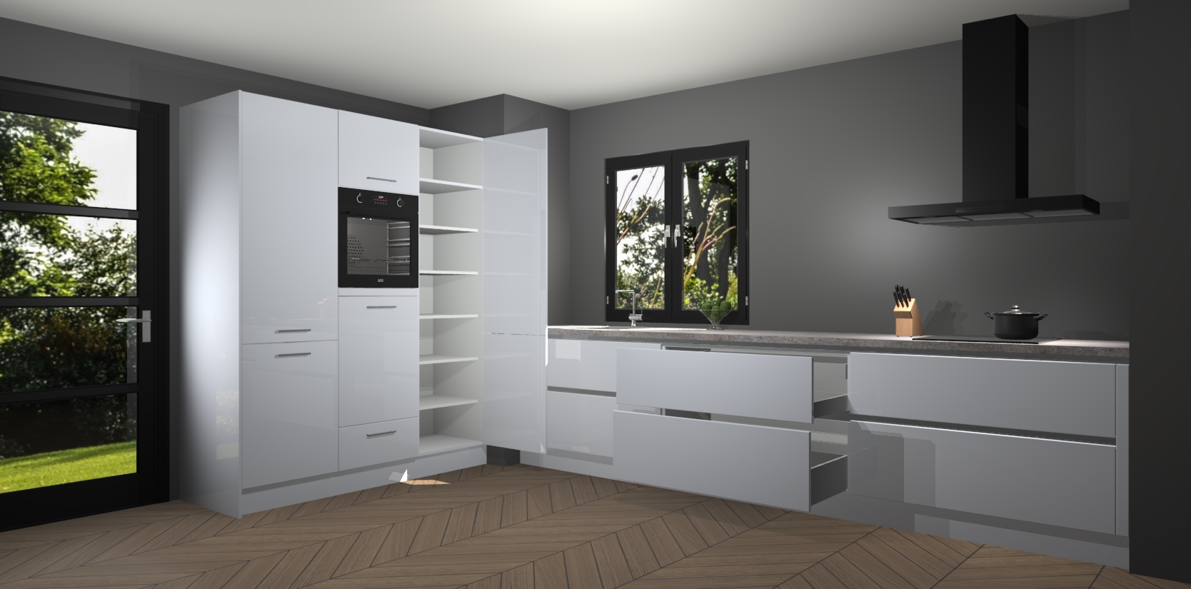 De softclose deuren openen en sluiten is ook heel eenvoudig - geniet van een moeiteloze keukenervaring, zelfs als er kinderen rondlopen. Voor extra gemak bij het plaatsen van uw bestelling bieden we ook een upgrade naar een kookplaat met geïntegreerde afzuiging.
