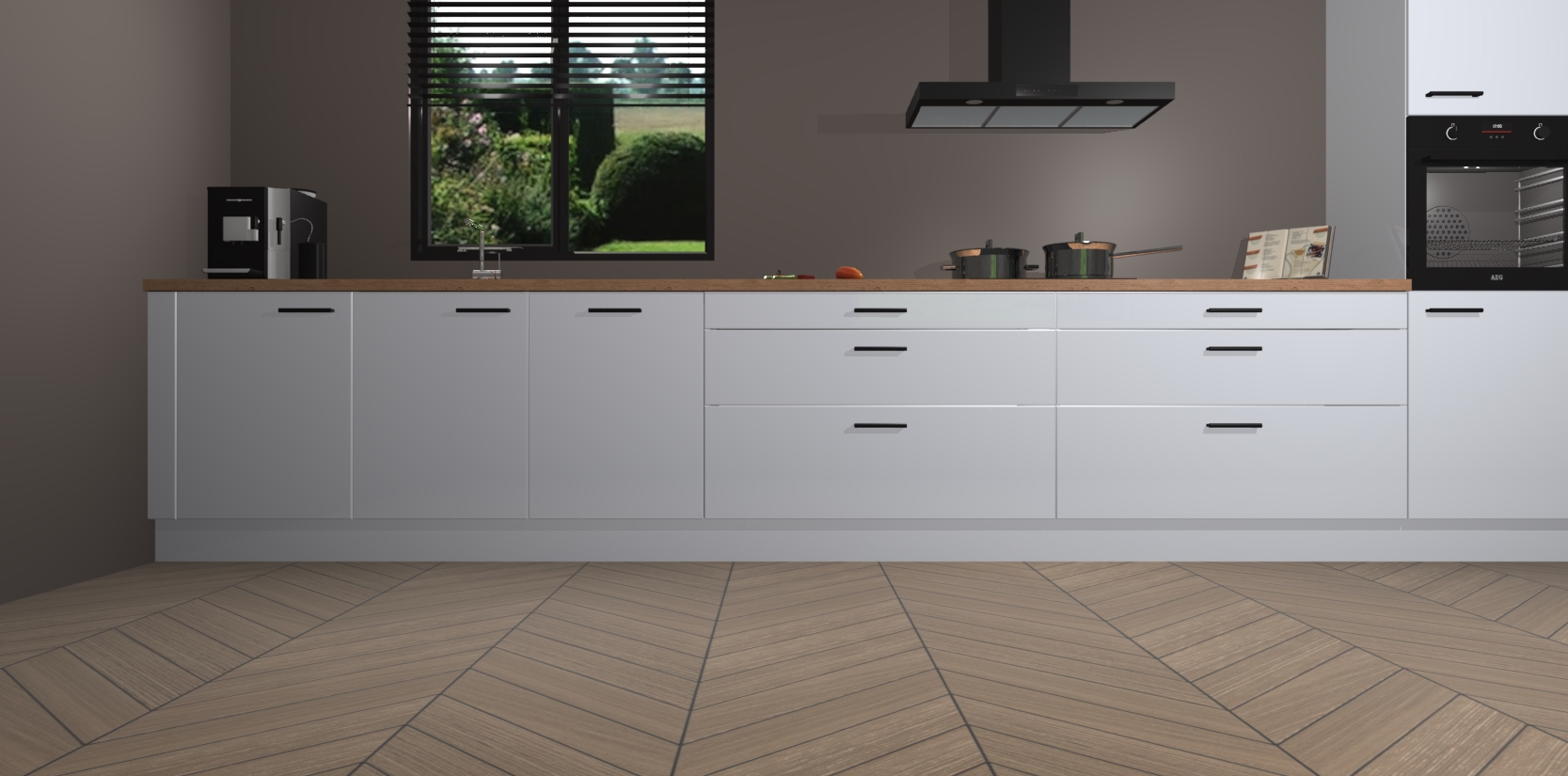 Een stijlvolle en praktische keuken als deze mag gezien worden. Dankzij de prachtige matte afwerking wordt de keuken gemakkelijk het middelpunt van uw huis - hij ziet er geweldig uit onder allerlei lichtomstandigheden, van dag tot nacht!