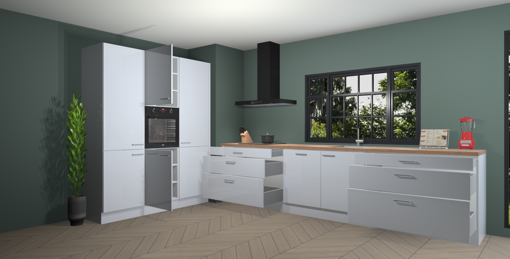 De softclose deuren openen en sluiten is ook heel eenvoudig - geniet van een moeiteloze keukenervaring, zelfs als er kinderen rondlopen. Voor extra gemak bij het plaatsen van uw bestelling bieden we ook een upgrade naar een kookplaat met geïntegreerde afzuiging.