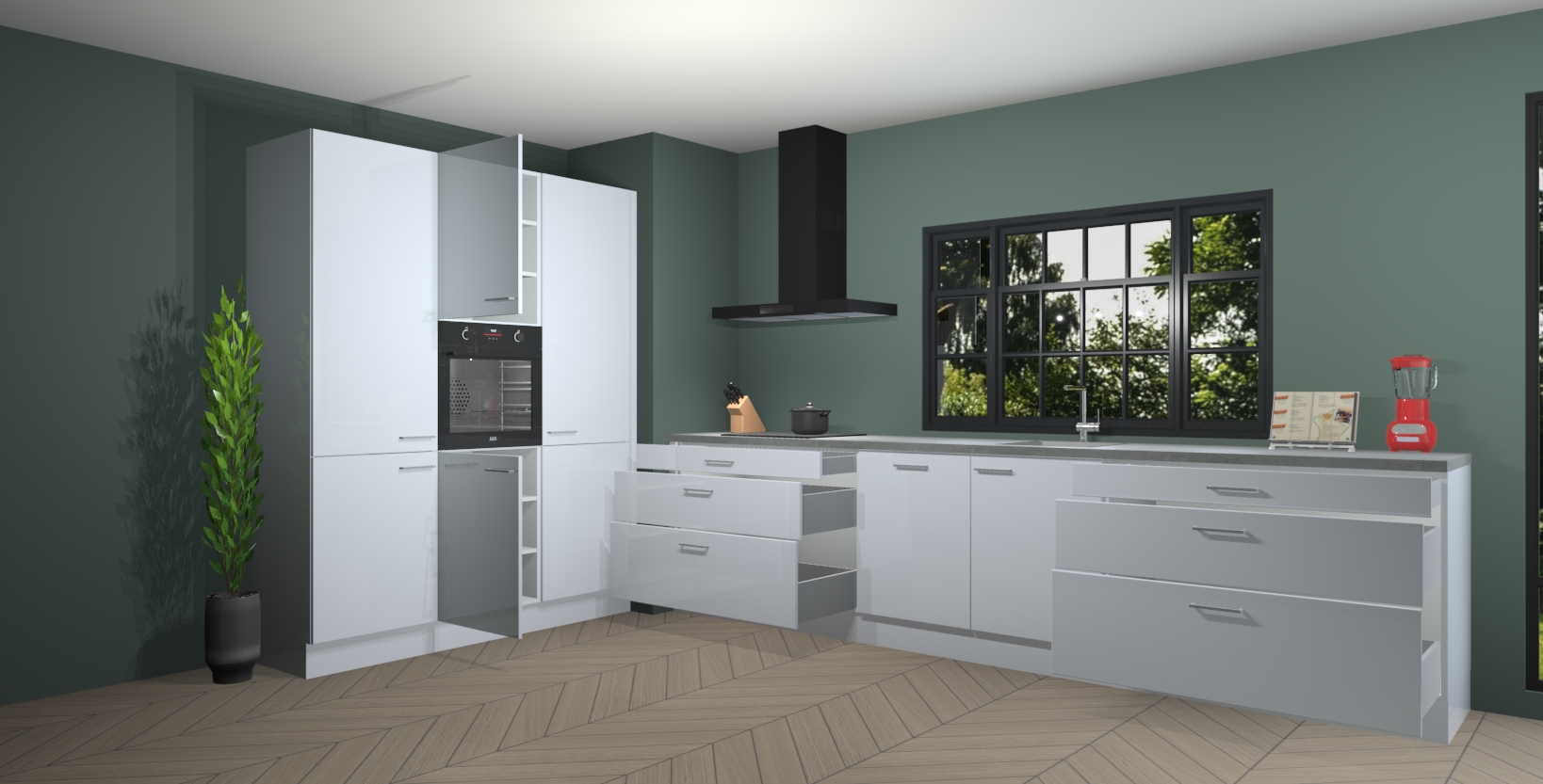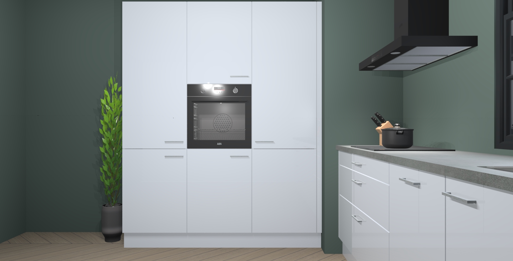 De softclose deuren openen en sluiten is ook heel eenvoudig - geniet van een moeiteloze keukenervaring, zelfs als er kinderen rondlopen. Voor extra gemak bij het plaatsen van uw bestelling bieden we ook een upgrade naar een kookplaat met geïntegreerde afzuiging.