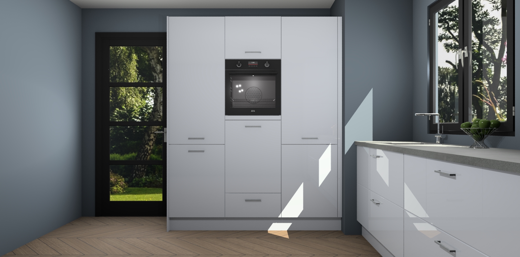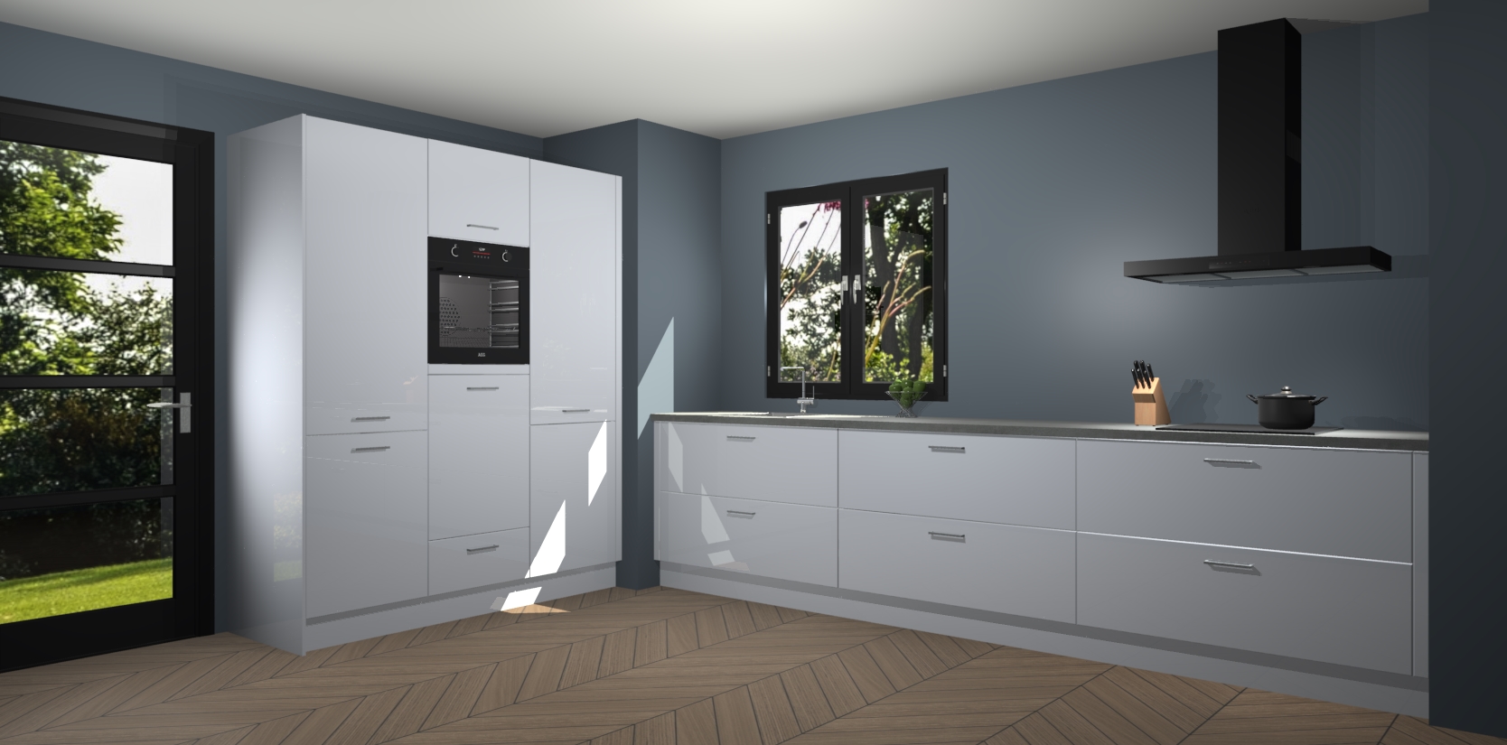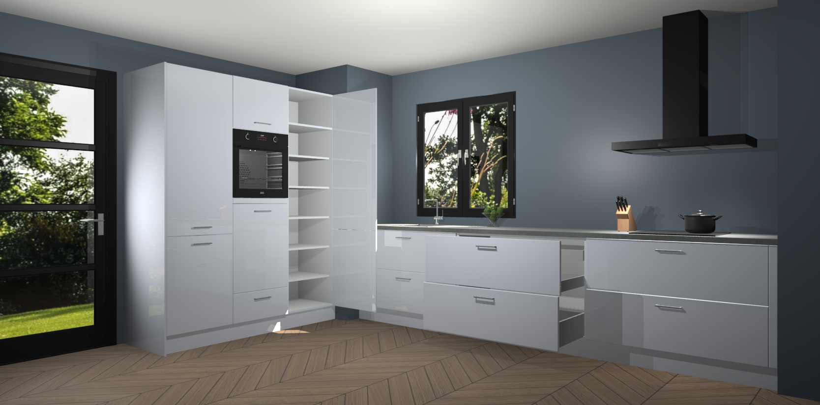 De softclose deuren openen en sluiten is ook heel eenvoudig - geniet van een moeiteloze keukenervaring, zelfs als er kinderen rondlopen. Voor extra gemak bij het plaatsen van uw bestelling bieden we ook een upgrade naar een kookplaat met geïntegreerde afzuiging.