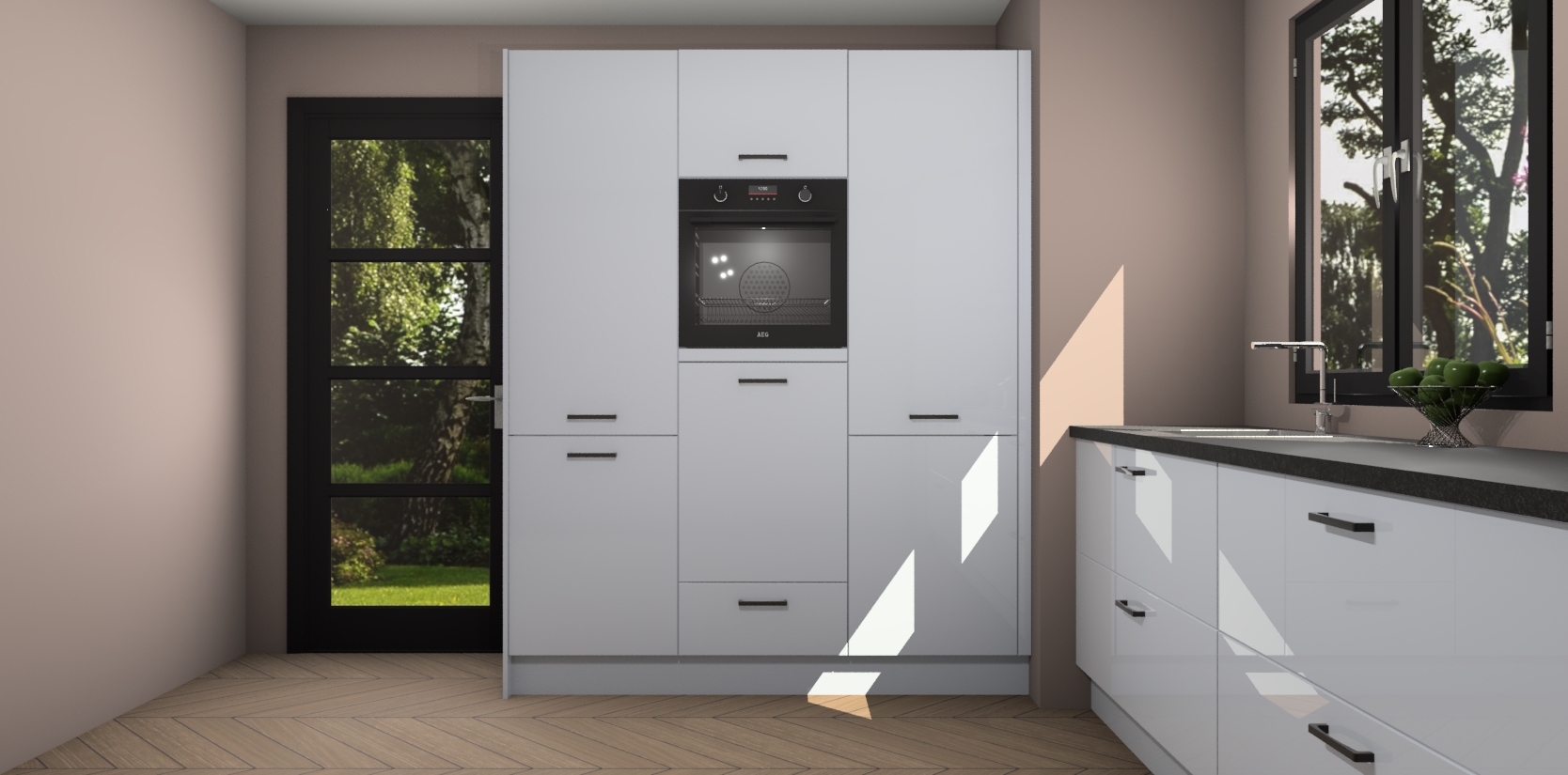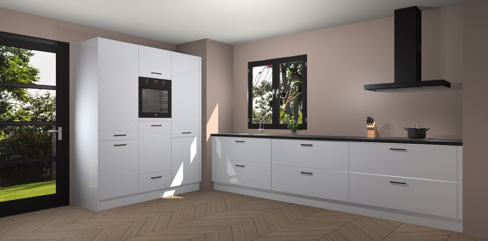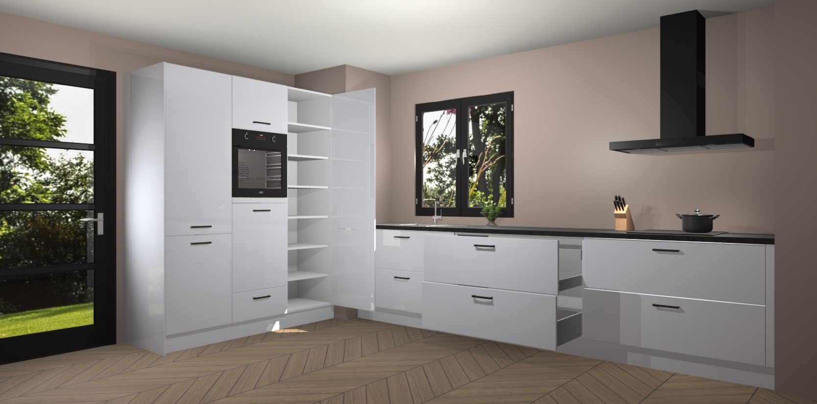 De softclose deuren openen en sluiten is ook heel eenvoudig - geniet van een moeiteloze keukenervaring, zelfs als er kinderen rondlopen. Voor extra gemak bij het plaatsen van uw bestelling bieden we ook een upgrade naar een kookplaat met geïntegreerde afzuiging.