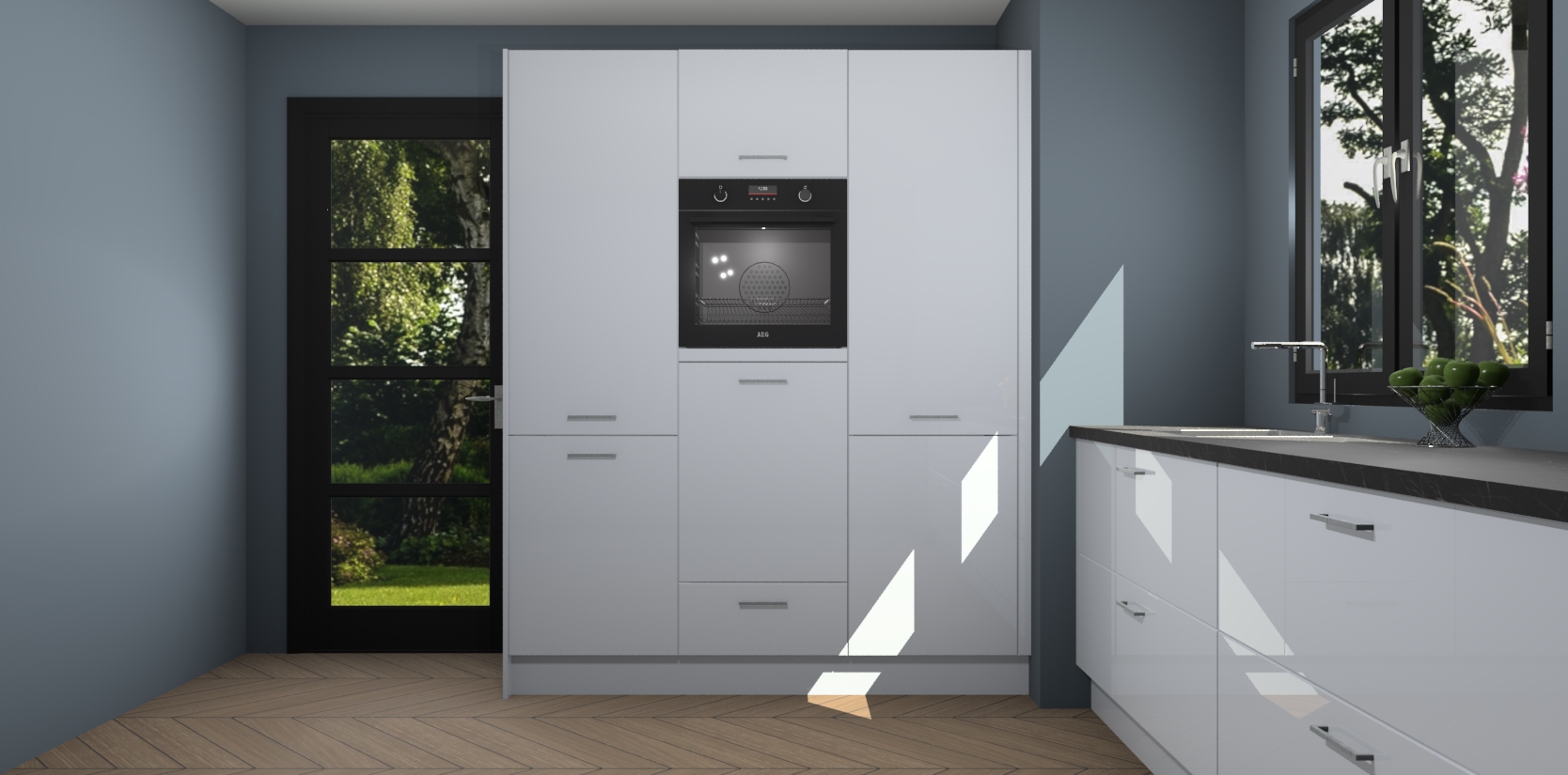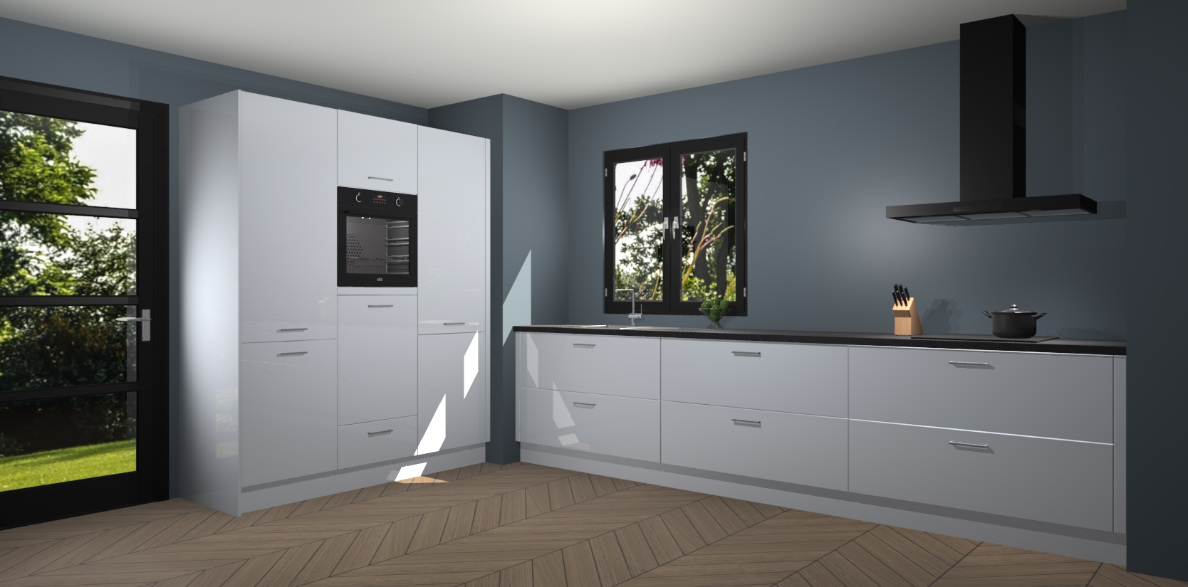 De softclose deuren openen en sluiten is ook heel eenvoudig - geniet van een moeiteloze keukenervaring, zelfs als er kinderen rondlopen. Voor extra gemak bij het plaatsen van uw bestelling bieden we ook een upgrade naar een kookplaat met geïntegreerde afzuiging.