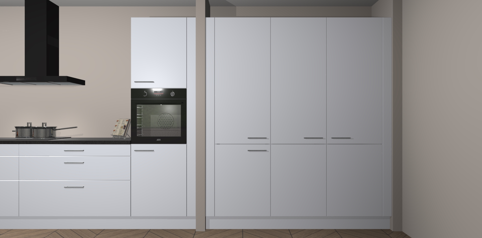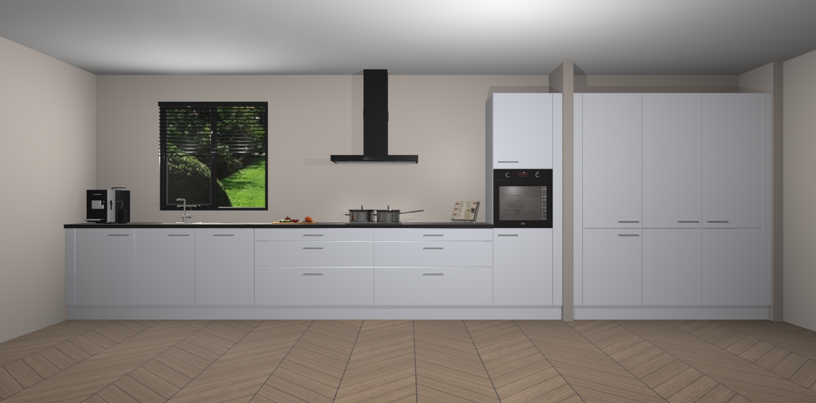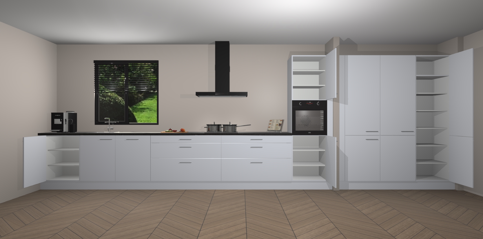 Een stijlvolle en praktische keuken als deze mag gezien worden. Dankzij de prachtige matte afwerking wordt de keuken gemakkelijk het middelpunt van uw huis - hij ziet er geweldig uit onder allerlei lichtomstandigheden, van dag tot nacht!