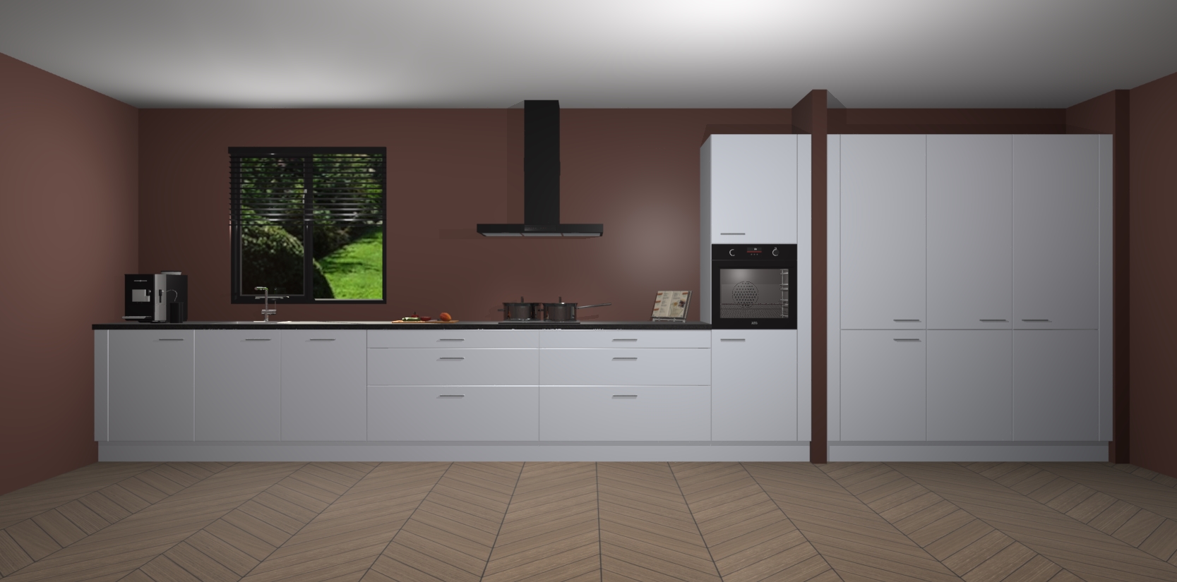Een stijlvolle en praktische keuken als deze mag gezien worden. Dankzij de prachtige matte afwerking wordt de keuken gemakkelijk het middelpunt van uw huis - hij ziet er geweldig uit onder allerlei lichtomstandigheden, van dag tot nacht!