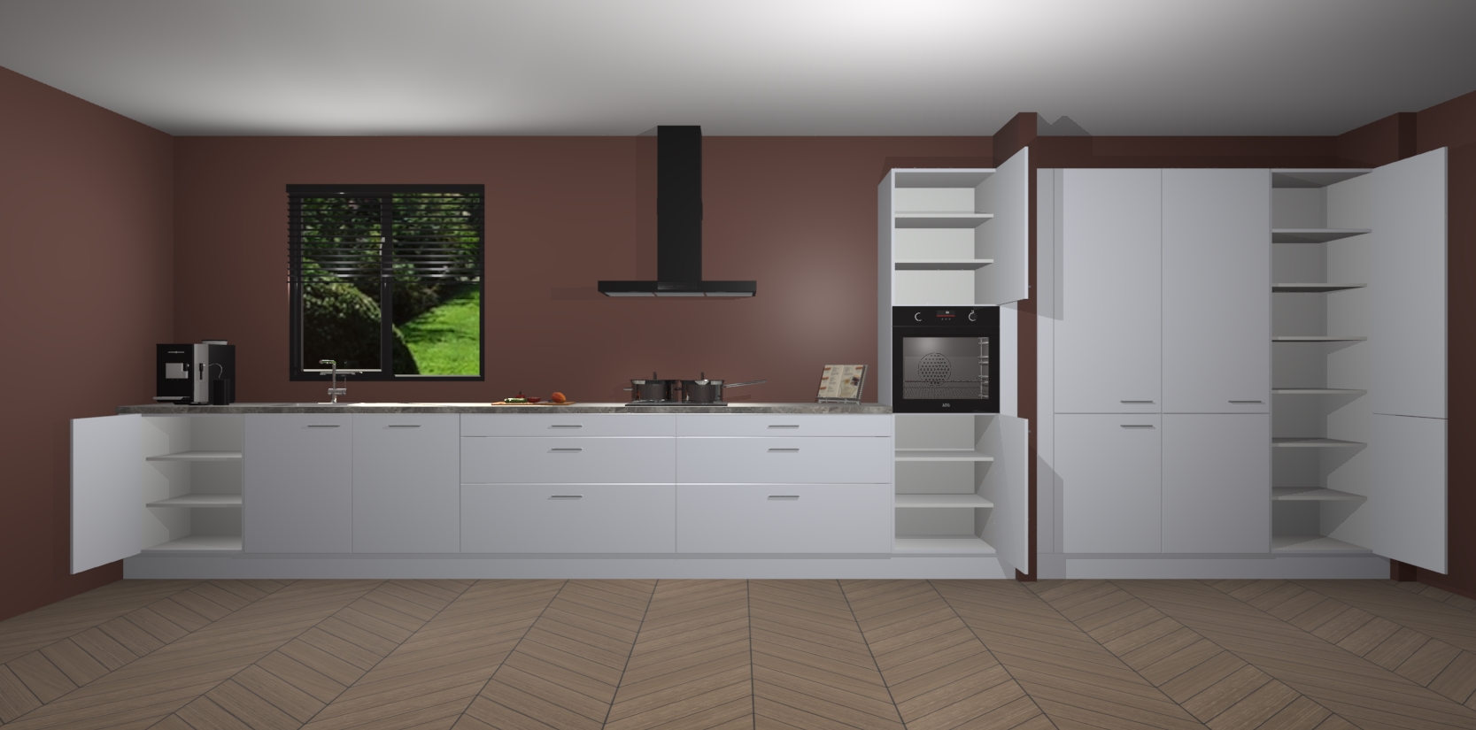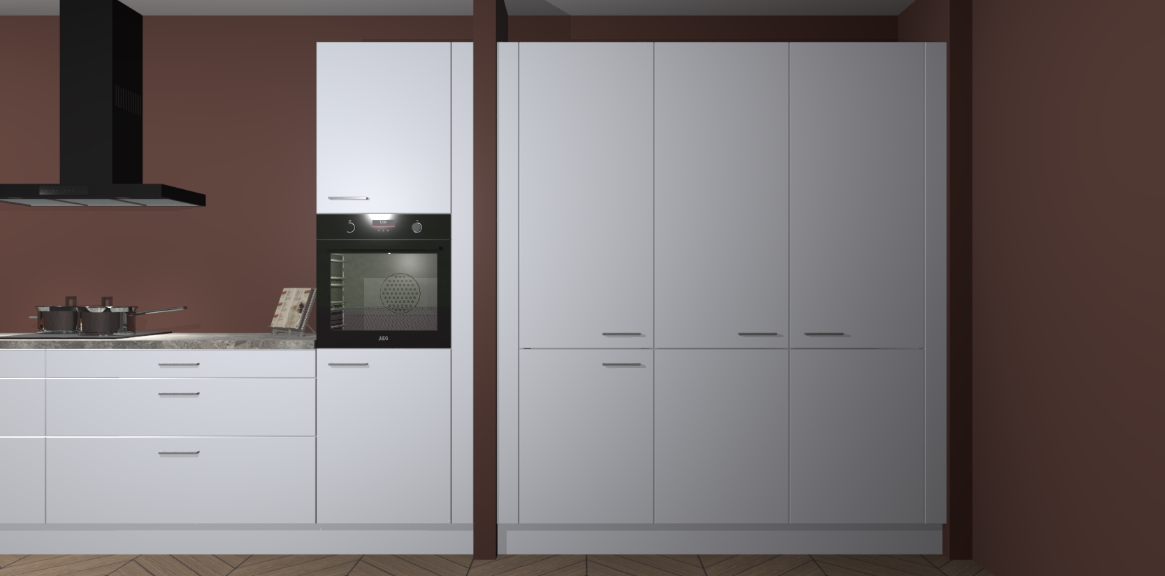 Een stijlvolle en praktische keuken als deze mag gezien worden. Dankzij de prachtige matte afwerking wordt de keuken gemakkelijk het middelpunt van uw huis - hij ziet er geweldig uit onder allerlei lichtomstandigheden, van dag tot nacht!