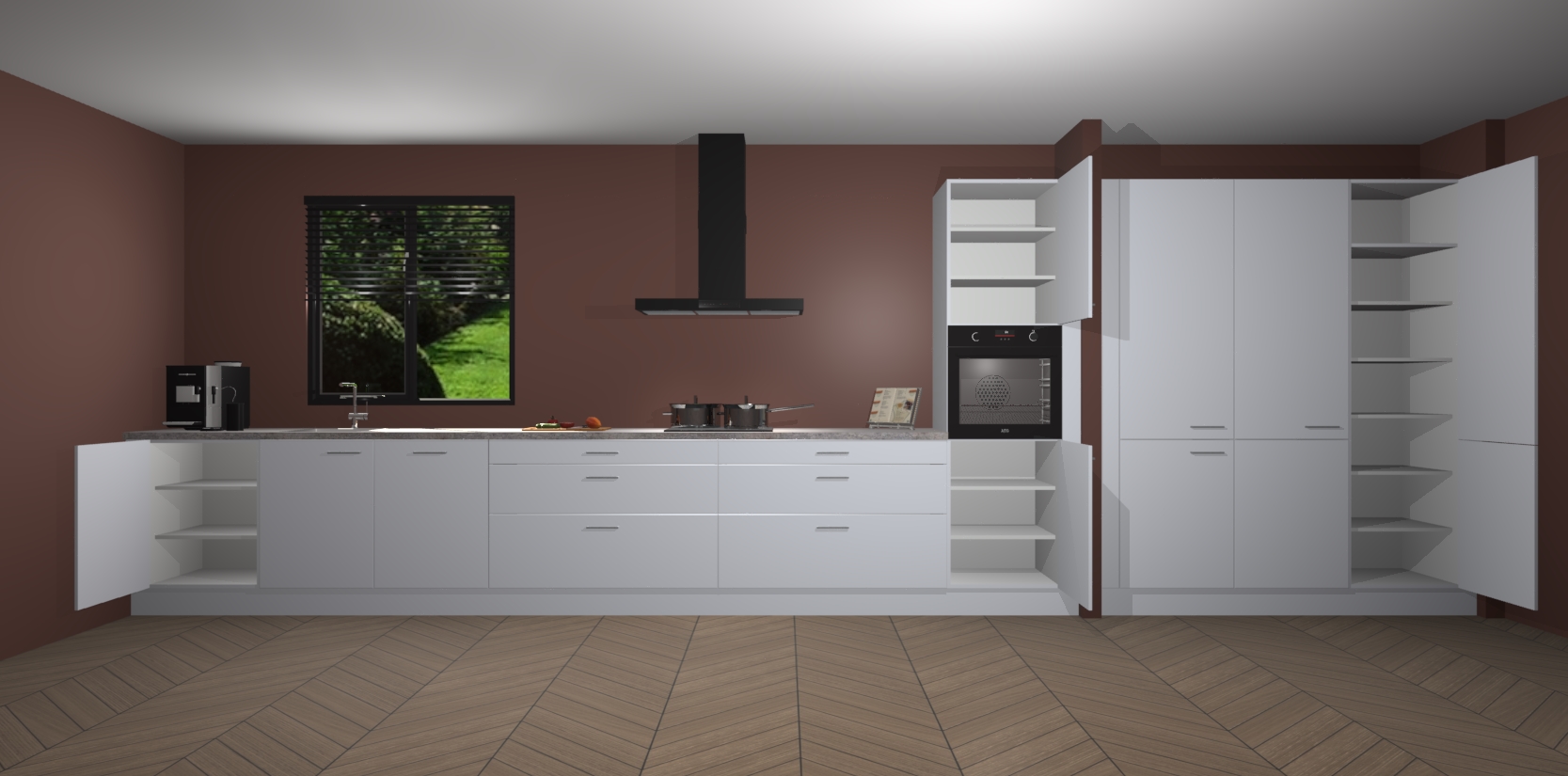 Een stijlvolle en praktische keuken als deze mag gezien worden. Dankzij de prachtige matte afwerking wordt de keuken gemakkelijk het middelpunt van uw huis - hij ziet er geweldig uit onder allerlei lichtomstandigheden, van dag tot nacht!