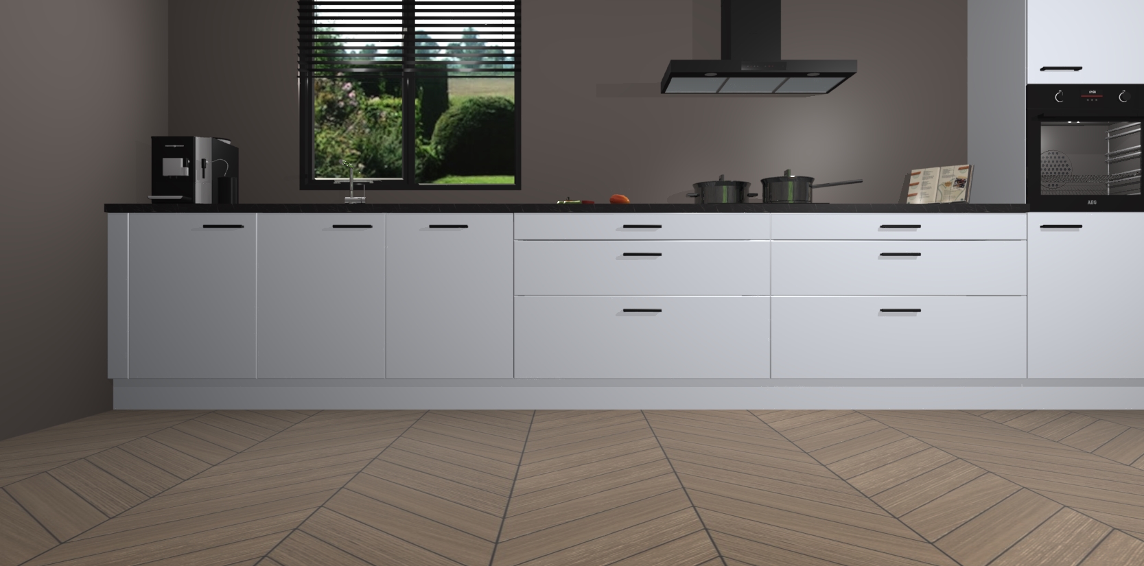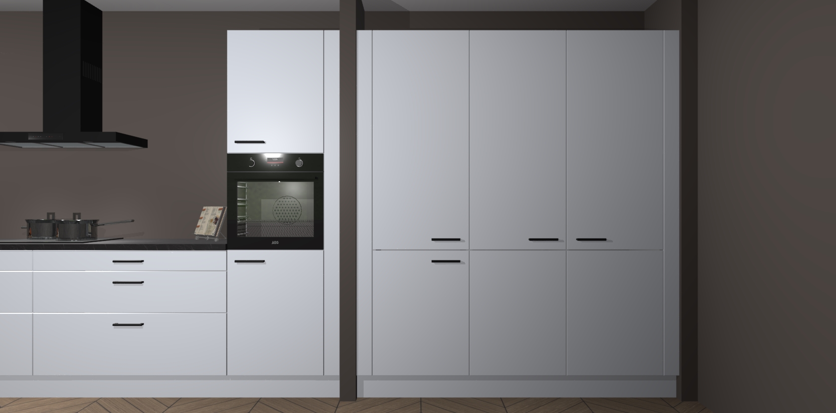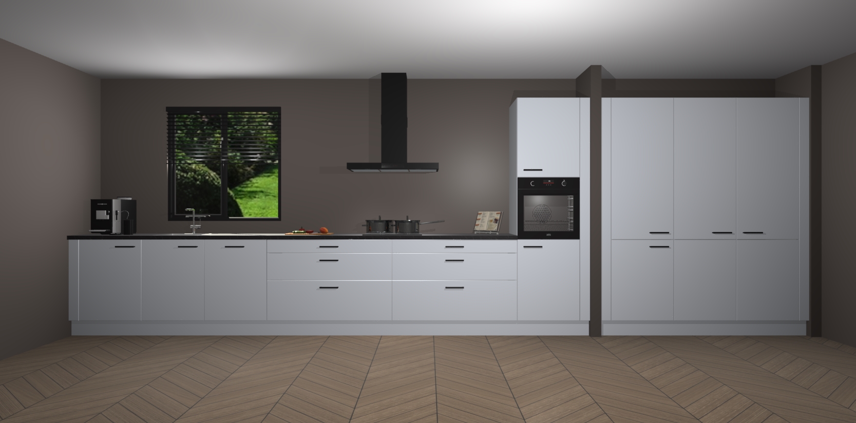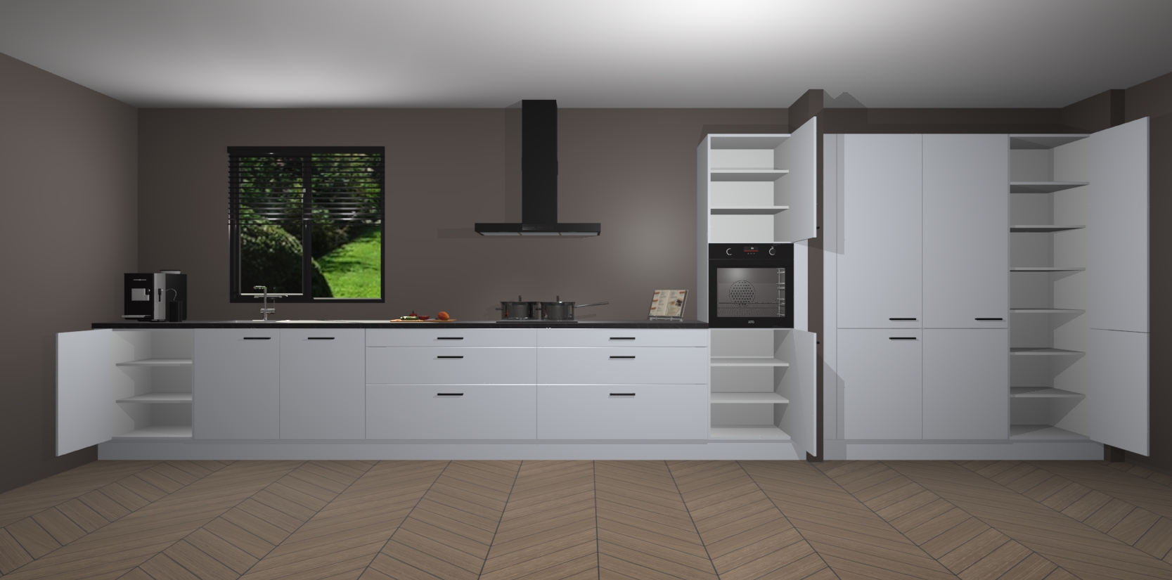 Een stijlvolle en praktische keuken als deze mag gezien worden. Dankzij de prachtige matte afwerking wordt de keuken gemakkelijk het middelpunt van uw huis - hij ziet er geweldig uit onder allerlei lichtomstandigheden, van dag tot nacht!