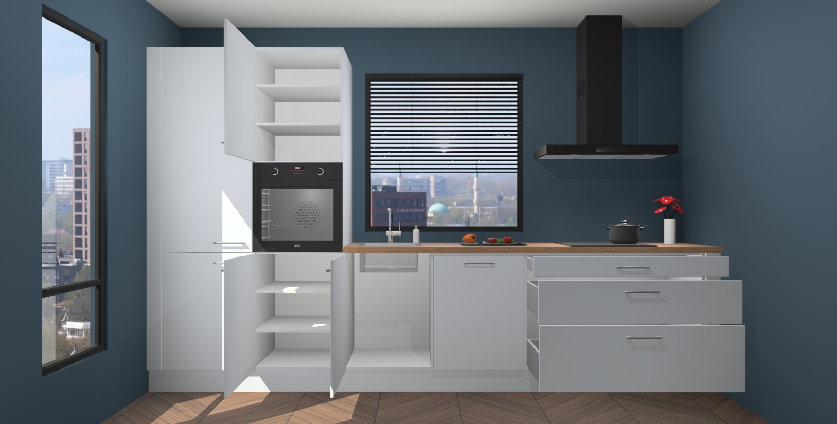 Met 5 geïntegreerde apparaten - oven, inductiekookplaat, afzuigkap, vaatwasser en koelkast - zorgt deze prachtige opstelling ervoor dat u alle benodigdheden hebt om uw favoriete gerechten te bereiden. Ze zijn voorzien van softclose deuren zodat u ze moeiteloos kunt openen en sluiten zonder schuren of lawaai.