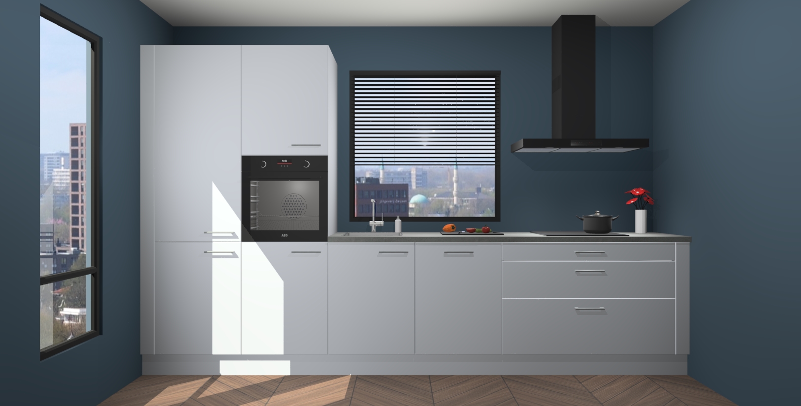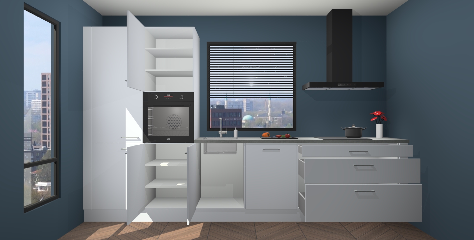 Met 5 geïntegreerde apparaten - oven, inductiekookplaat, afzuigkap, vaatwasser en koelkast - zorgt deze prachtige opstelling ervoor dat u alle benodigdheden hebt om uw favoriete gerechten te bereiden. Ze zijn voorzien van softclose deuren zodat u ze moeiteloos kunt openen en sluiten zonder schuren of lawaai.