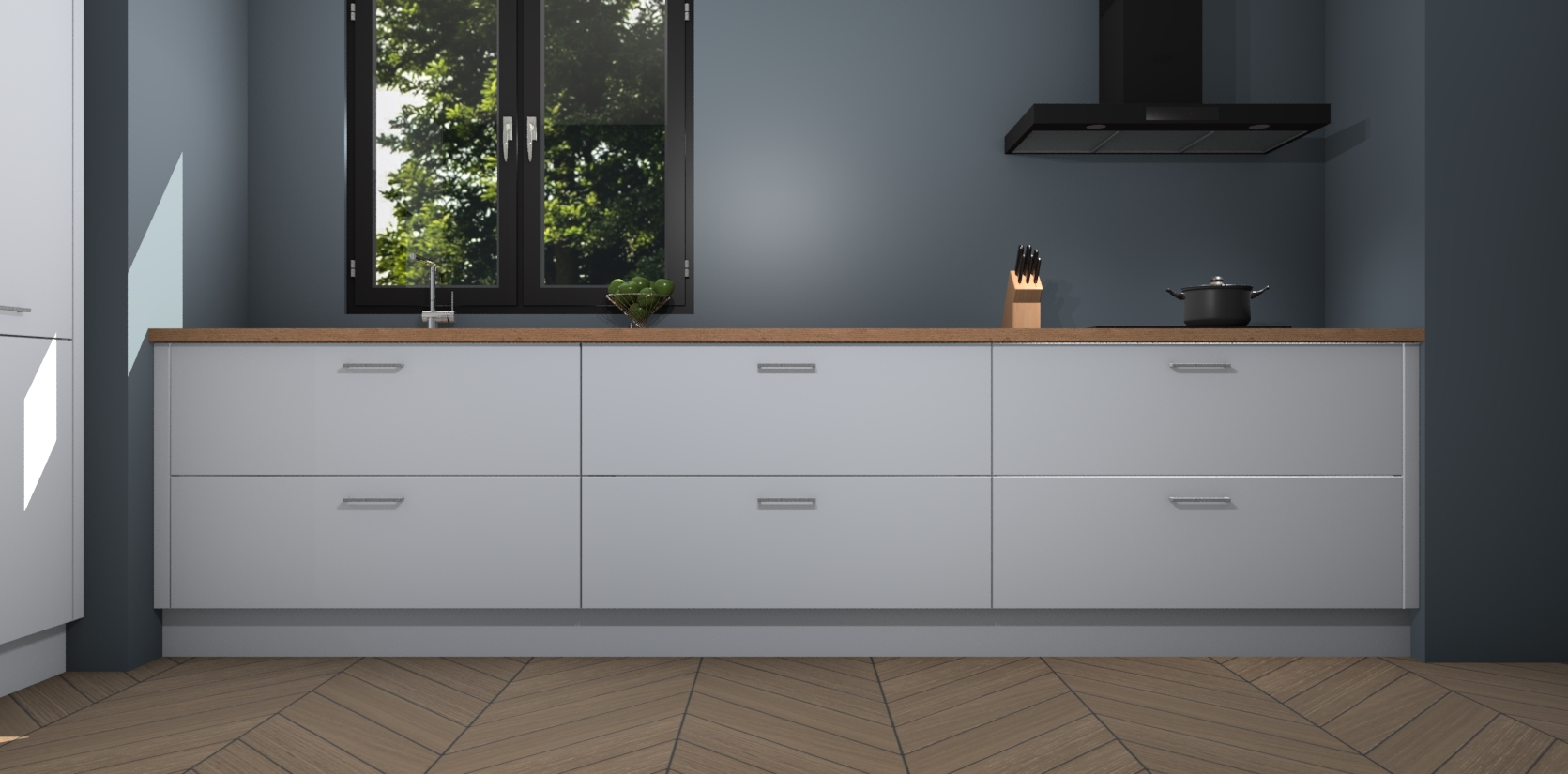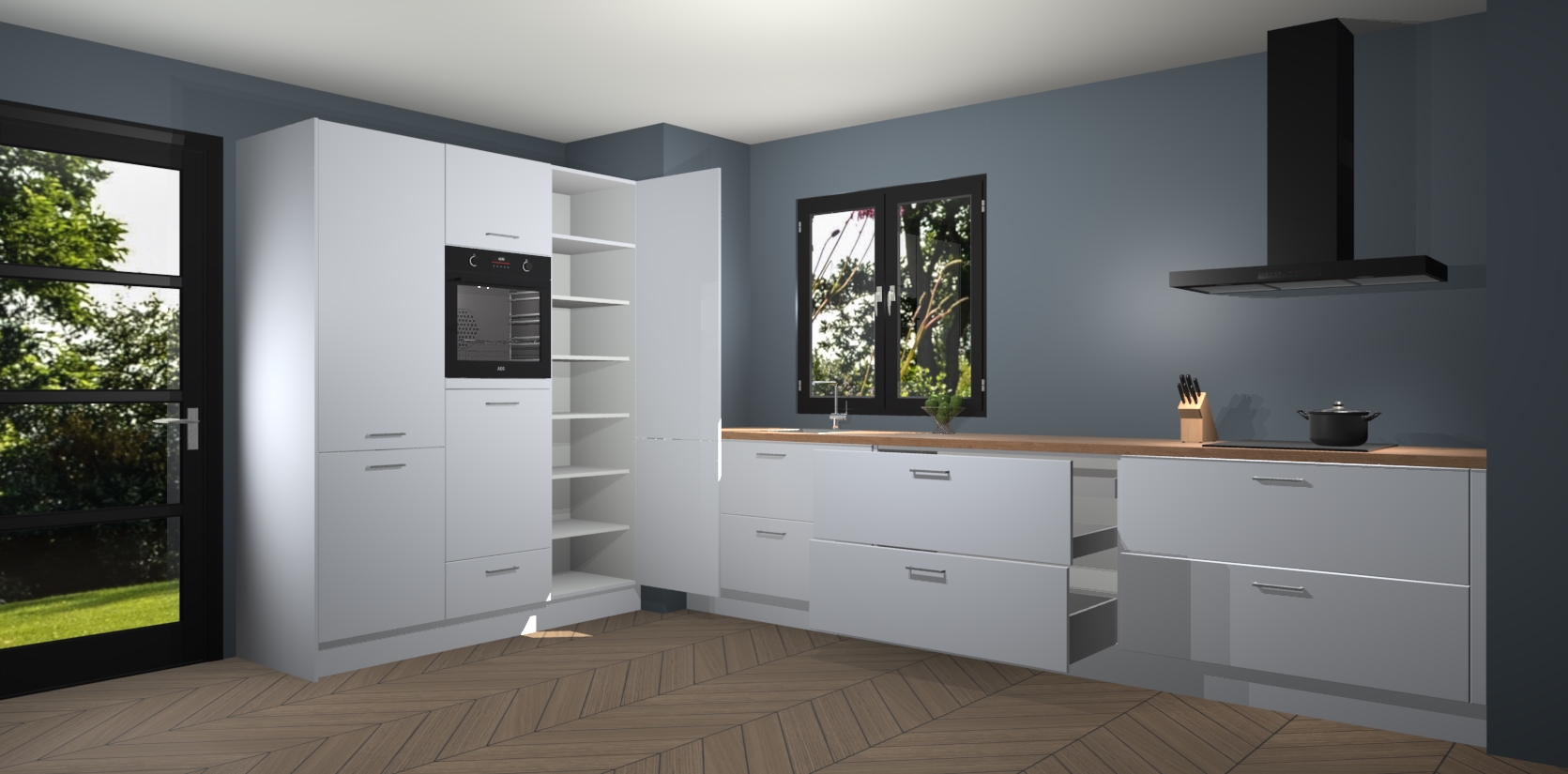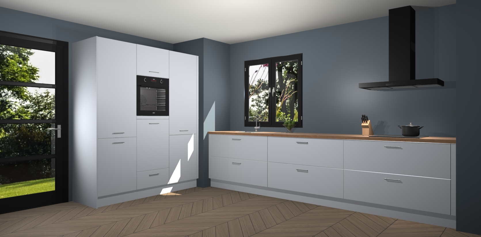 De softclose deuren openen en sluiten is ook heel eenvoudig - geniet van een moeiteloze keukenervaring, zelfs als er kinderen rondlopen. Voor extra gemak bij het plaatsen van uw bestelling bieden we ook een upgrade naar een kookplaat met geïntegreerde afzuiging.