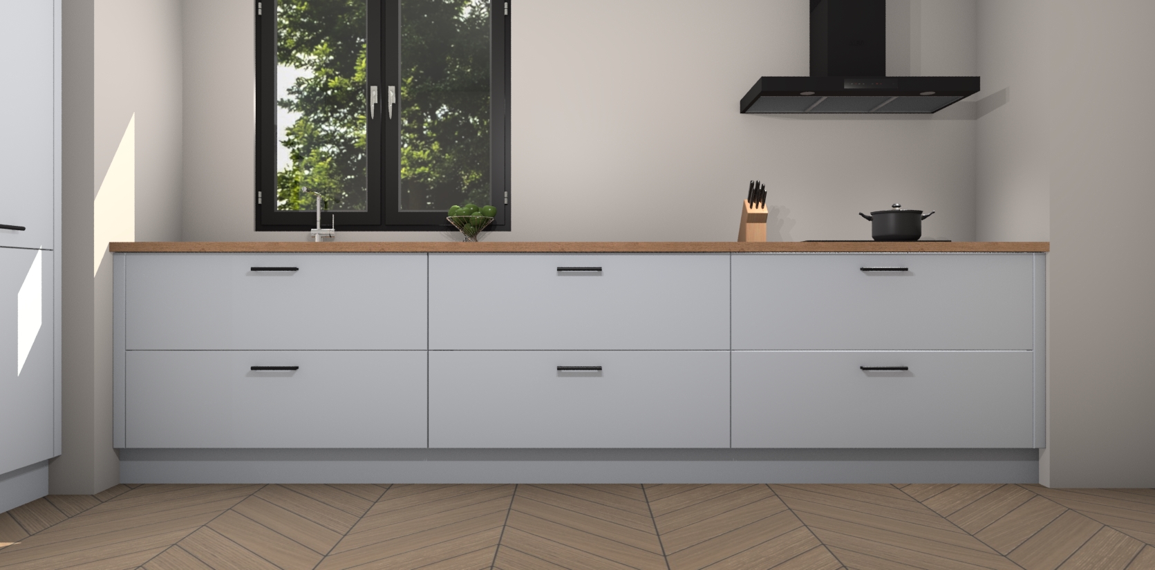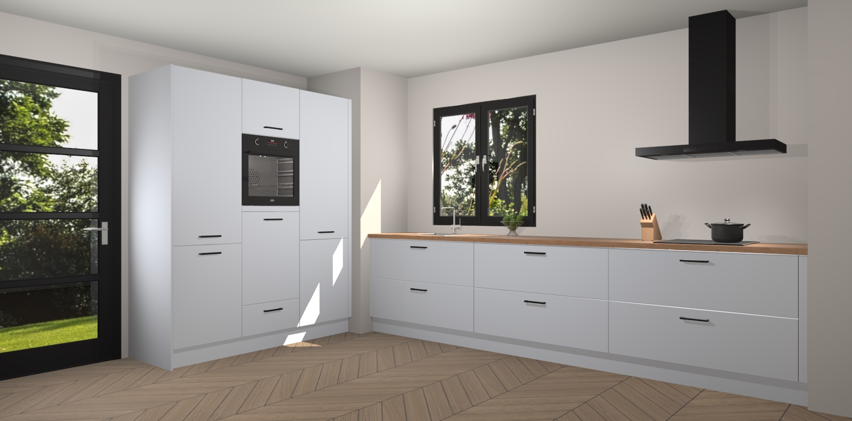De softclose deuren openen en sluiten is ook heel eenvoudig - geniet van een moeiteloze keukenervaring, zelfs als er kinderen rondlopen. Voor extra gemak bij het plaatsen van uw bestelling bieden we ook een upgrade naar een kookplaat met geïntegreerde afzuiging.