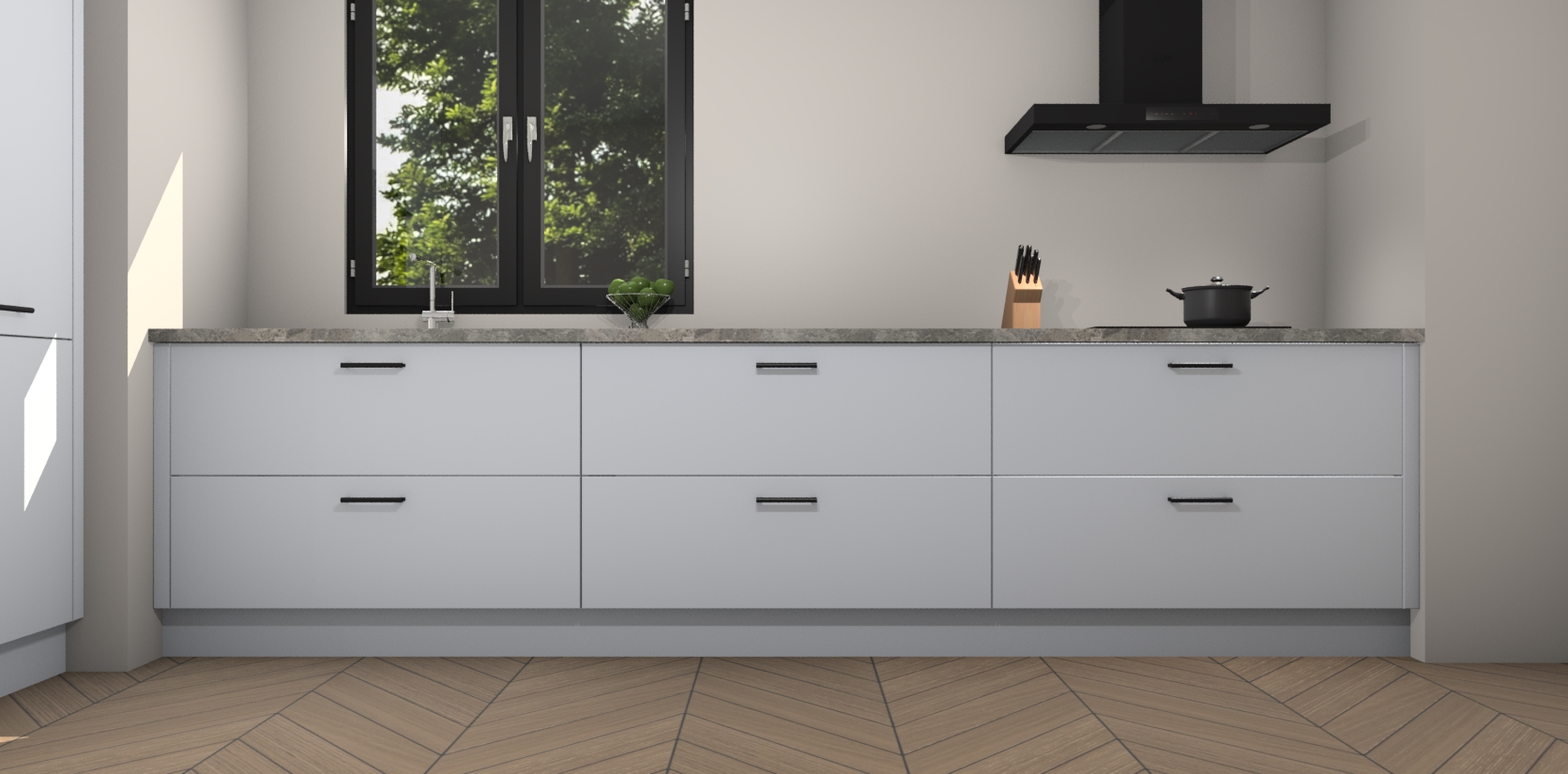 De softclose deuren openen en sluiten is ook heel eenvoudig - geniet van een moeiteloze keukenervaring, zelfs als er kinderen rondlopen. Voor extra gemak bij het plaatsen van uw bestelling bieden we ook een upgrade naar een kookplaat met geïntegreerde afzuiging.