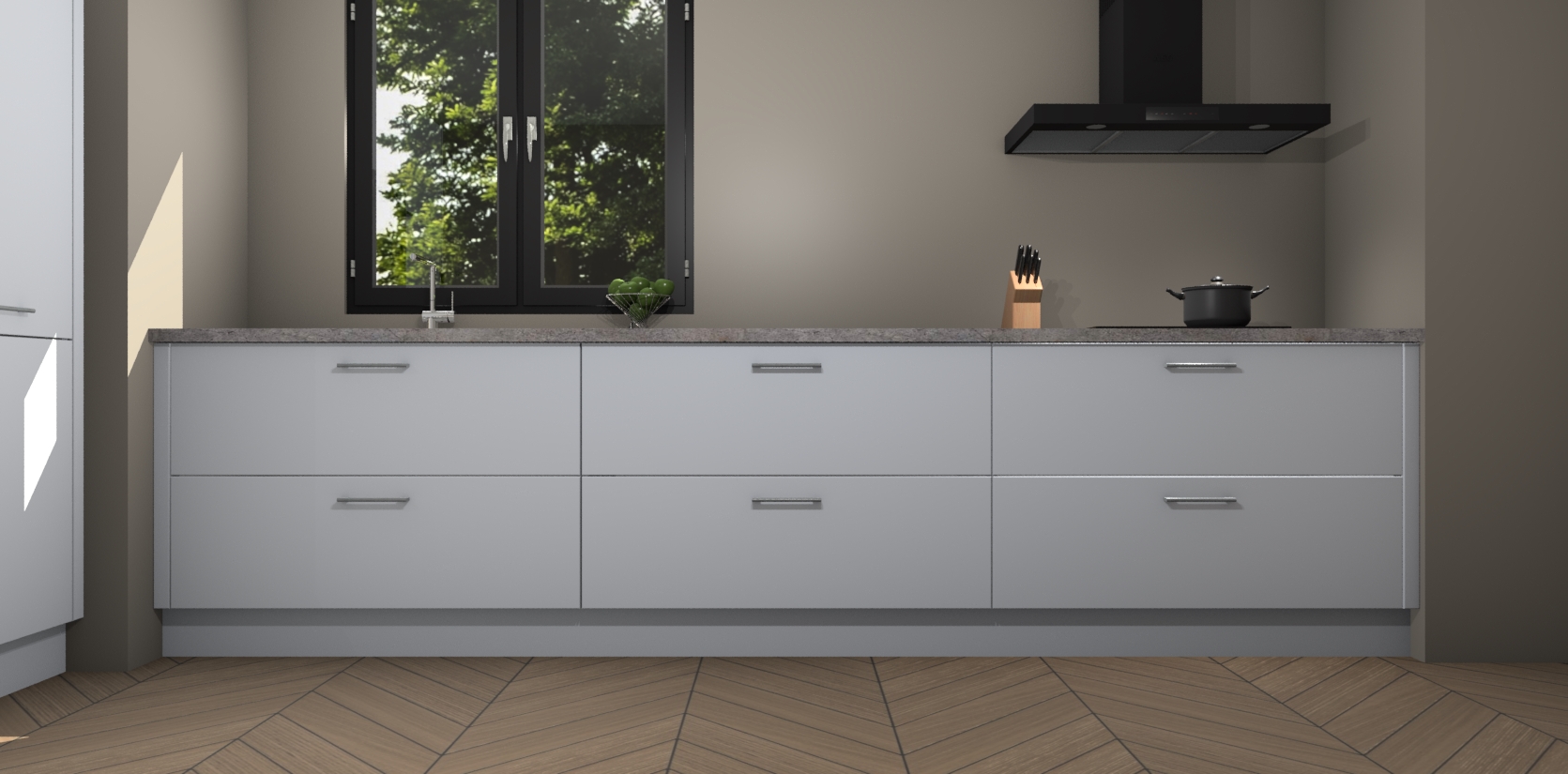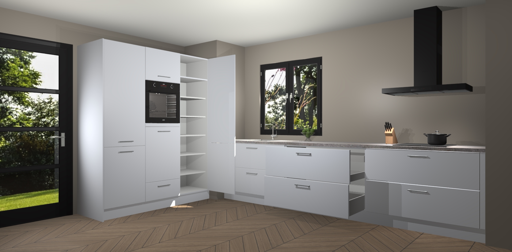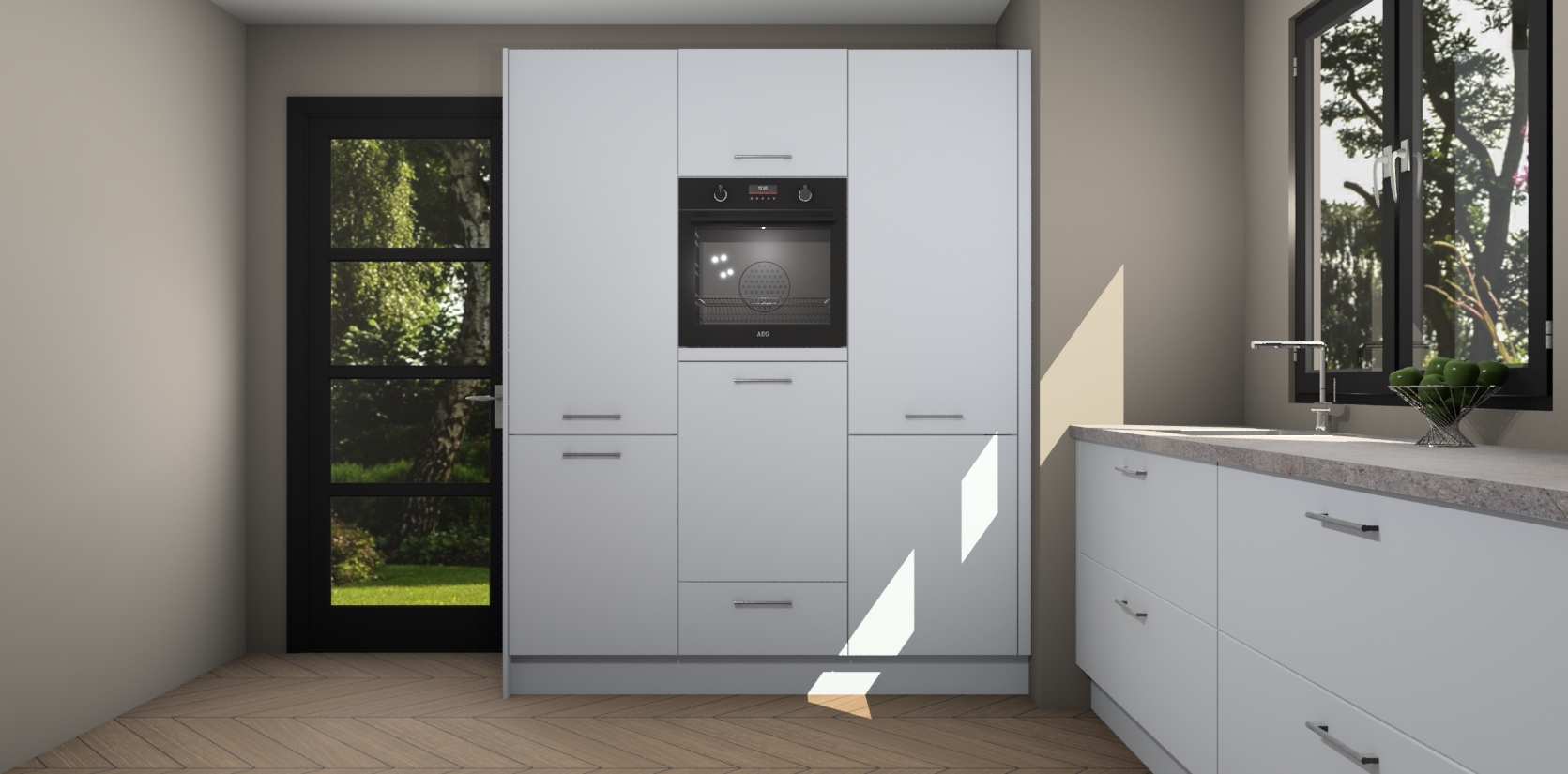 De softclose deuren openen en sluiten is ook heel eenvoudig - geniet van een moeiteloze keukenervaring, zelfs als er kinderen rondlopen. Voor extra gemak bij het plaatsen van uw bestelling bieden we ook een upgrade naar een kookplaat met geïntegreerde afzuiging.