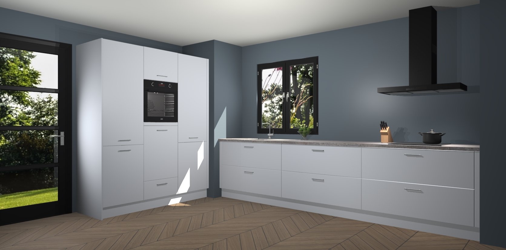 De softclose deuren openen en sluiten is ook heel eenvoudig - geniet van een moeiteloze keukenervaring, zelfs als er kinderen rondlopen. Voor extra gemak bij het plaatsen van uw bestelling bieden we ook een upgrade naar een kookplaat met geïntegreerde afzuiging.