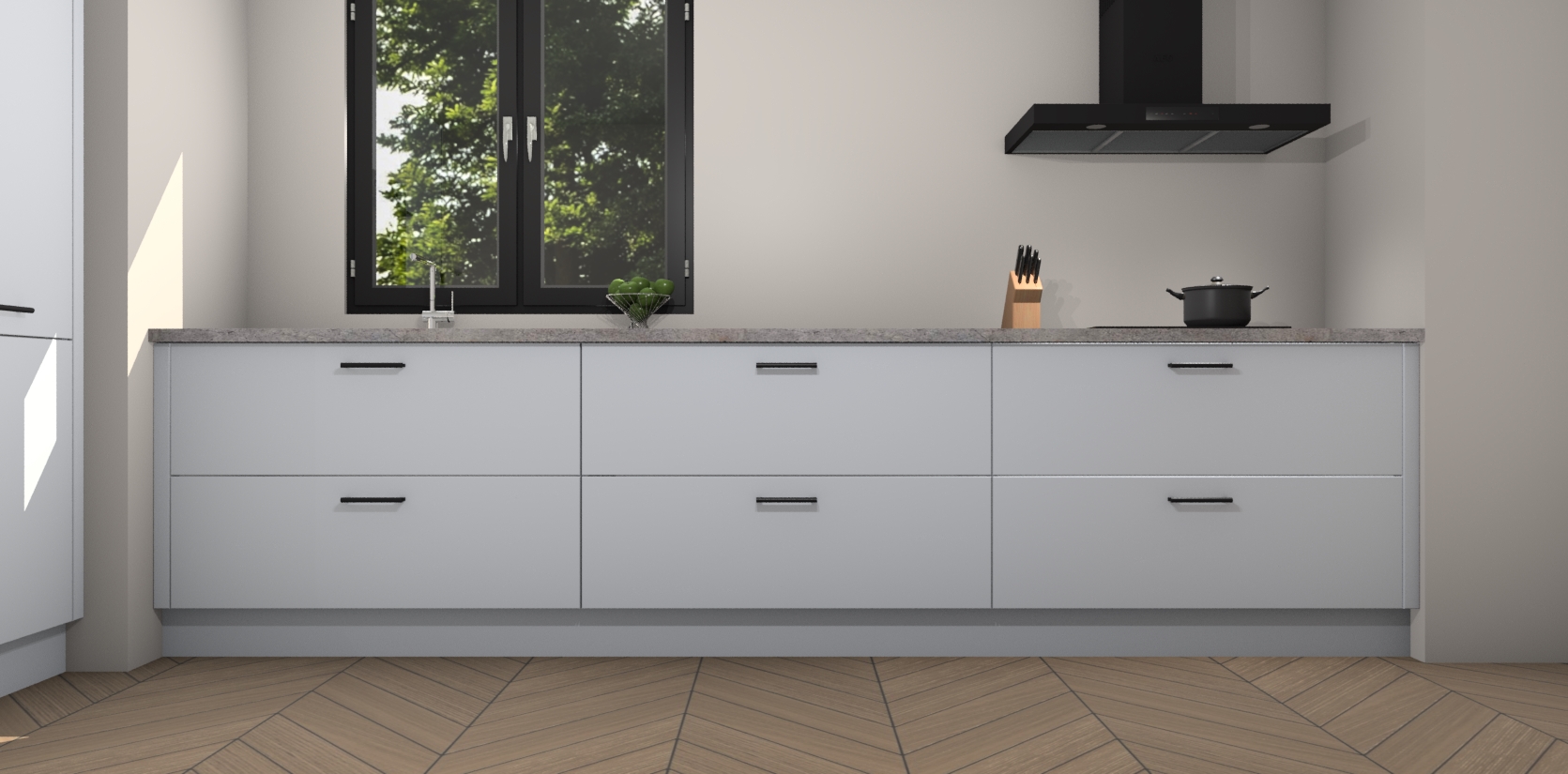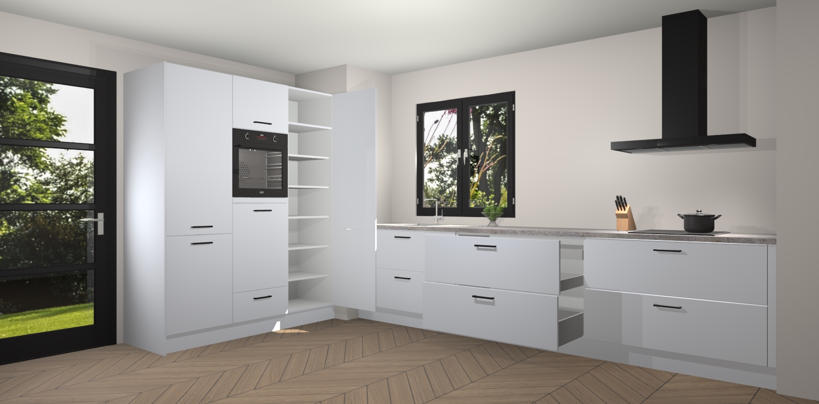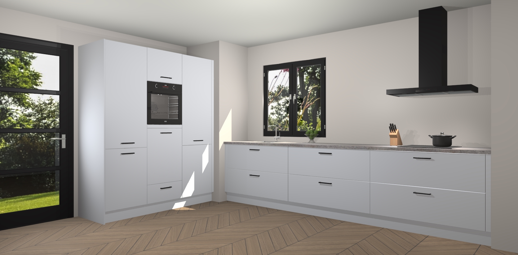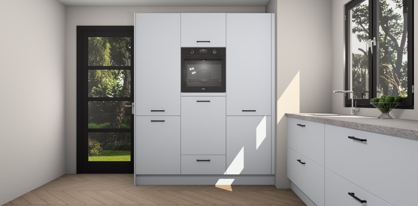 De softclose deuren openen en sluiten is ook heel eenvoudig - geniet van een moeiteloze keukenervaring, zelfs als er kinderen rondlopen. Voor extra gemak bij het plaatsen van uw bestelling bieden we ook een upgrade naar een kookplaat met geïntegreerde afzuiging.